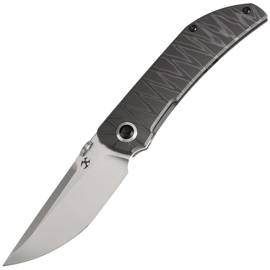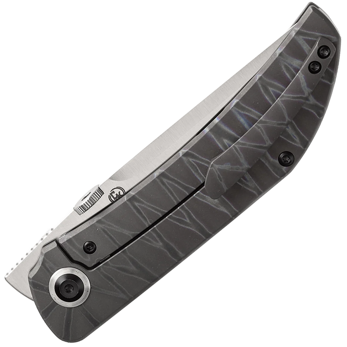 The Tarkin Folding Knife features an ultra-thin 3mm modified tanto blade crafted from CPM 20CV steel, offering superior cutting precision and durability.Whether for detailed work or everyday tasks, the thinness of the blade ensures smooth performance, making it perfect for slicing, fine cuts, and tasks requiring precision. The Tarkin is constructed with full titanium contoured scales that offer a smooth, comfortable grip, while maintaining a lightweight yet durable build. The textured titanium backspacer and 3D milled titanium pocket clip enhance its aesthetic appeal and ensure secure, easy carry. Despite its slim profile, it feels sturdy in hand, featuring super thin ergonomics for comfort without sacrificing grip, and a solid framelock for reliable, confident use. The Tarkin offers multiple opening methods, featuring both a Thumb Disc and a Front Flipper for versatile deployment. With caged ceramic ball bearings, the action is incredibly smooth and responsive, ensuring effortless opening every time.