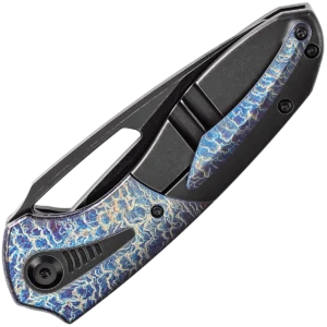 The Thoth features a modified wharncliffe blade that exemplifies precision and functionality. Crafted from premium CPM 20CV steel, this blade ensures exceptional durability and edge retention. The hollow grind finish enhances its slicing capabilities, providing clean, effortless cuts. The combination of handle materials enhances both the aesthetics and the tactile experience of the knife, adding a touch of elegance and sophistication to its design. The Thoth offers an ergonomic grip, featuring a curved handle with chamfered edges and a titanium backspacer, ensuring a smooth, comfortable hold without any sharp edges. The handle’s flowing lines fit naturally in the palm, providing a snug and secure grip. A thumb ramp on the spine allows for a stable, controlled hold, enhancing precision during use. This knife utilizes caged ball bearings for smooth deployment, and the elongated thumb hole on the blade allows for easy access.