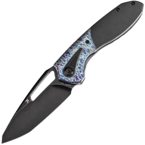 The Thoth features a modified wharncliffe blade that exemplifies precision and functionality. Crafted from premium CPM 20CV steel, this blade ensures exceptional durability and edge retention. The hollow grind finish enhances its slicing capabilities, providing clean, effortless cuts. The combination of handle materials enhances both the aesthetics and the tactile experience of the knife, adding a touch of elegance and sophistication to its design. The Thoth offers an ergonomic grip, featuring a curved handle with chamfered edges and a titanium backspacer, ensuring a smooth, comfortable hold without any sharp edges. The handle’s flowing lines fit naturally in the palm, providing a snug and secure grip. A thumb ramp on the spine allows for a stable, controlled hold, enhancing precision during use. This knife utilizes caged ball bearings for smooth deployment, and the elongated thumb hole on the blade allows for easy access.