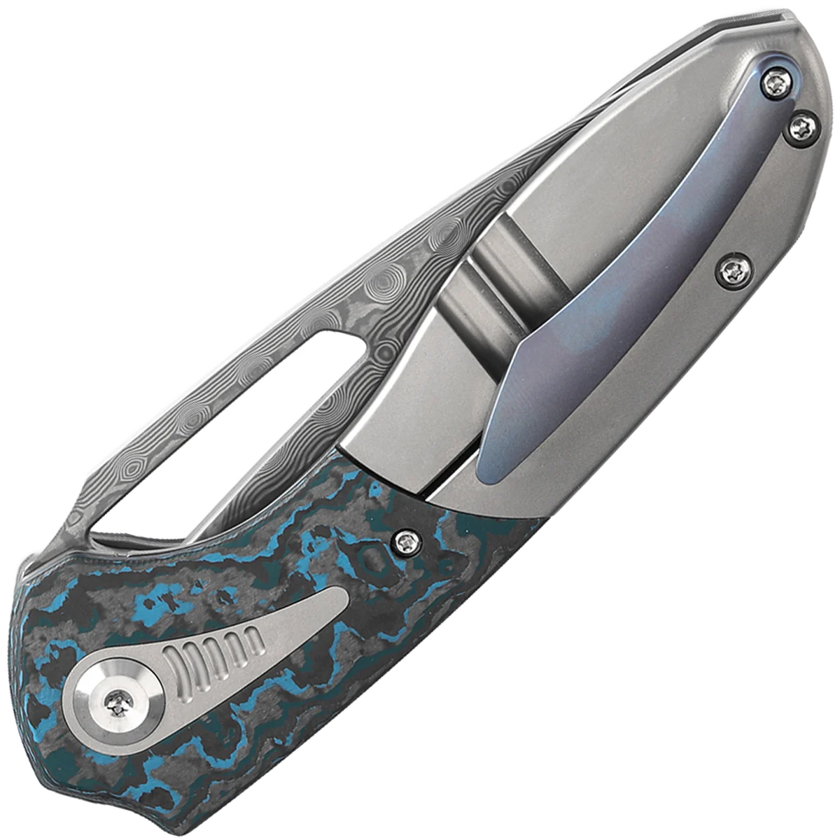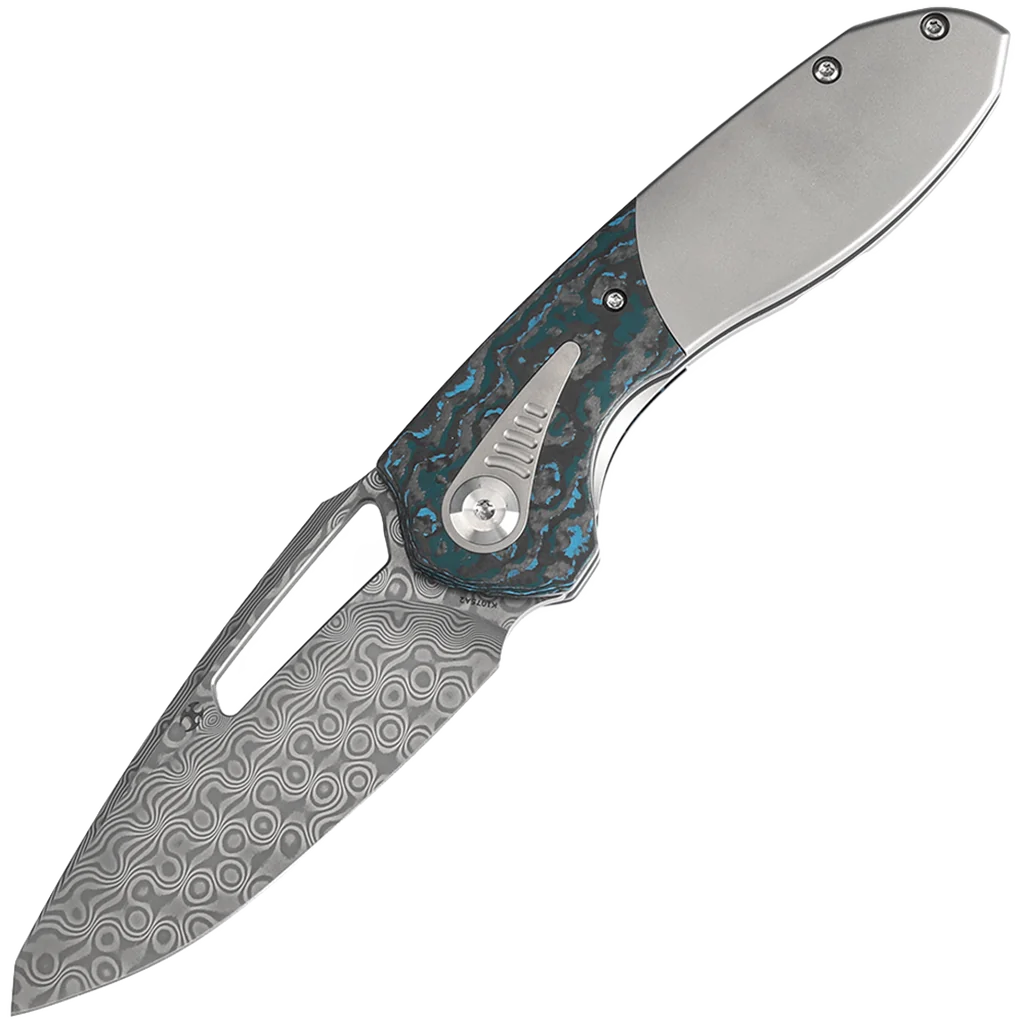 The Thoth features a modified wharncliffe blade that exemplifies precision and functionality. Crafted from premium Damascus steel, this blade ensures exceptional durability and edge retention. The Damascus steel Kansept use is a premium composite of 9Cr and 440C stainless steels, distinguishing it from lower-quality options. The hollow grind finish enhances its slicing capabilities, providing clean, effortless cuts. The handle features a dual-material construction, seamlessly combining titanium with carbon fiber inlays. This combination of materials enhances both the aesthetics and the tactile experience of the knife, adding a touch of elegance and sophistication to its design. The Thoth offers an ergonomic grip, featuring a curved handle with chamfered edges and a titanium backspacer, ensuring a smooth, comfortable hold without any sharp edges. The handle’s flowing lines fit naturally in the palm, providing a snug and secure grip. A thumb ramp on the spine allows for a stable, controlled hold, enhancing precision during use. This knife utilizes caged ball bearings for smooth deployment, and the elongated thumb hole on the blade allows for easy access.