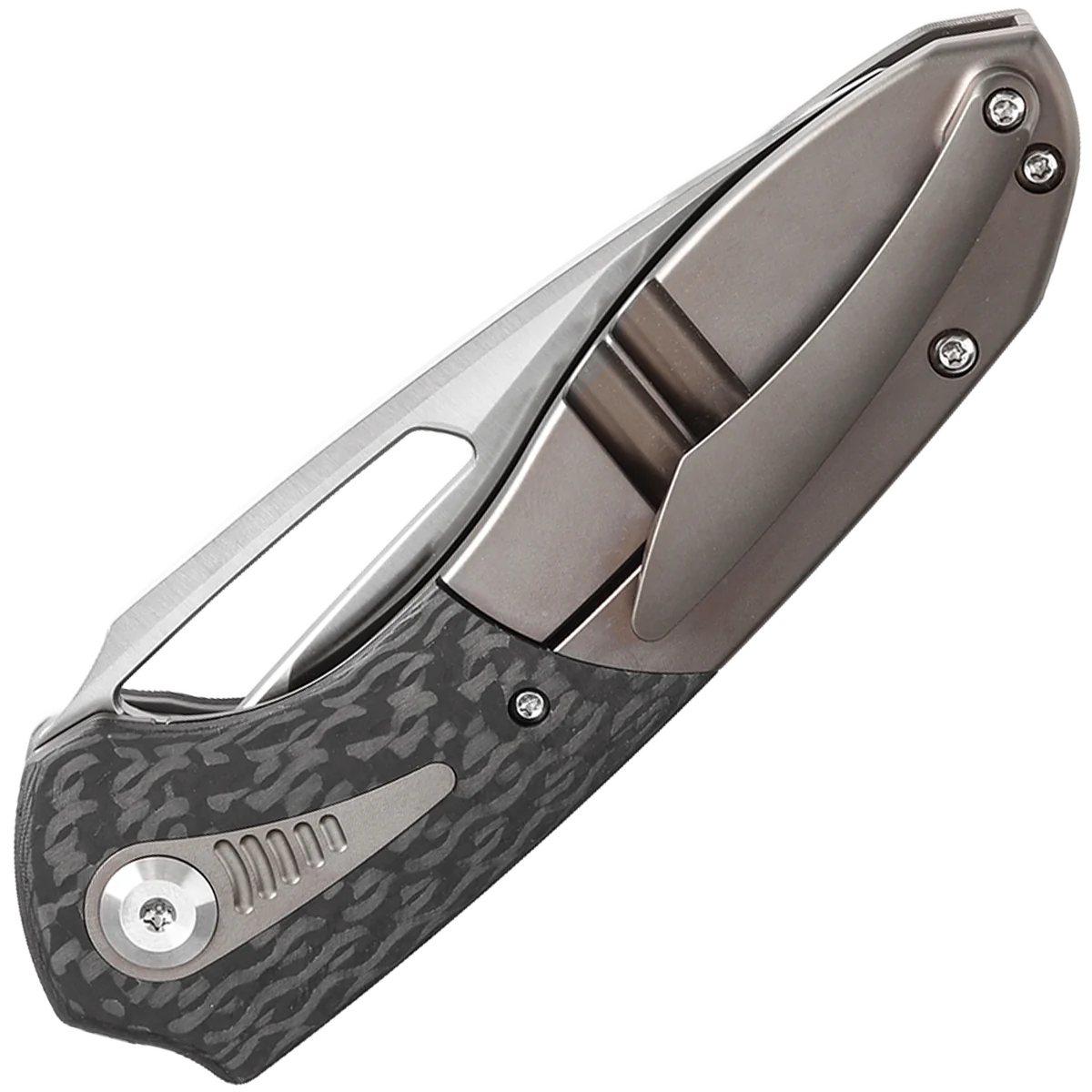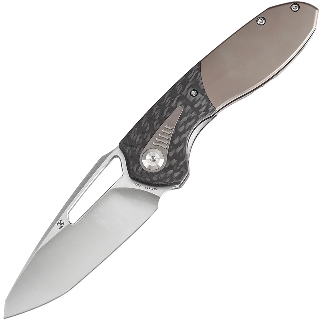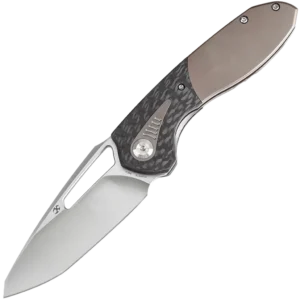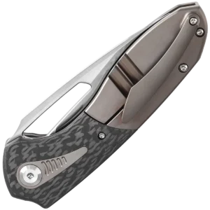 The Thoth features a modified wharncliffe blade that exemplifies precision and functionality. Crafted from premium CPM 20CV steel, this blade ensures exceptional durability and edge retention. The hollow grind finish enhances its slicing capabilities, providing clean, effortless cuts. The handle features a dual-material construction, seamlessly combining titanium with carbon fiber inlays. This combination of materials enhances both the aesthetics and the tactile experience of the knife, adding a touch of elegance and sophistication to its design. The Thoth offers an ergonomic grip, featuring a curved handle with chamfered edges and a titanium backspacer, ensuring a smooth, comfortable hold without any sharp edges. The handle’s flowing lines fit naturally in the palm, providing a snug and secure grip. A thumb ramp on the spine allows for a stable, controlled hold, enhancing precision during use. This knife utilizes caged ball bearings for smooth deployment, and the elongated thumb hole on the blade allows for easy access.