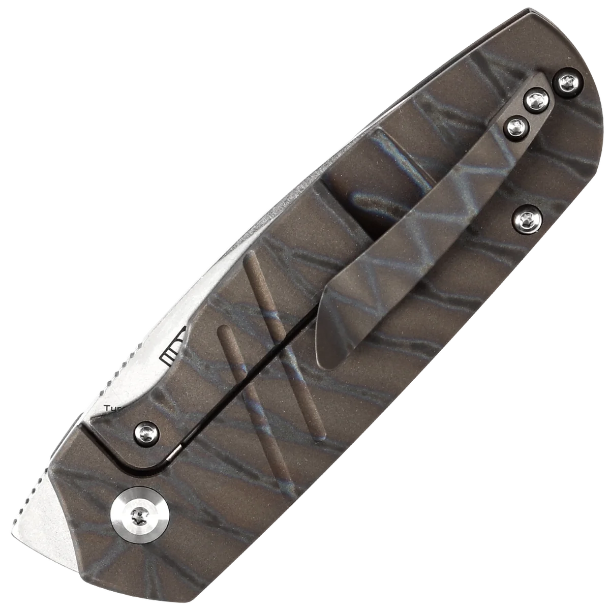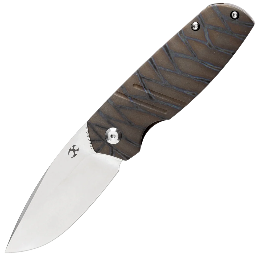 The front-flipping Turaco is a compact yet amazingly robust pocket knife that’s built for your everyday cutting needs. The highly versatile 2.85" CPM-S3VN blade excels at precision cuts and comes with a distinct swedge. The crisp action compliments the satisfying click sound made from the lockbar locking the blade in place. The handles are made from solid titanium for top-notch lightweight performance and unmatched durability. While smooth, the minimalistic handle grooves and great ergonomics provide more than enough grip for daily use.
