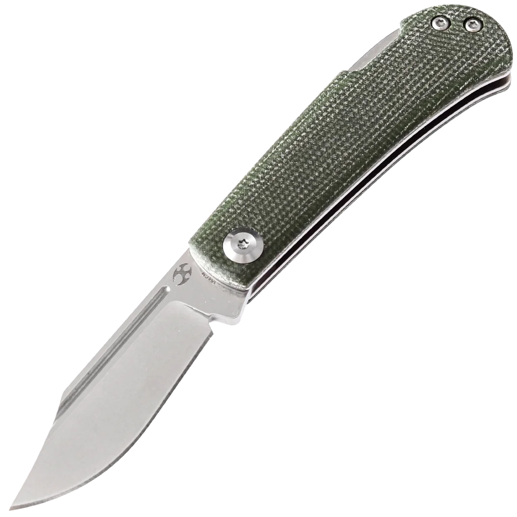 The Kansept Wedge gentleman's knife, designed by Nick Swan, is sleek and sophisticated. It has a lockback mechanism compared to the slip joint design of its sister model, the Bevy. The green micarta handle is ergonomically shaped, with a smooth gripping surface that is comfortable in the pocket or hand. The 2.45" blade is constructed from stonewashed 154CM blade steel, which provides a tough blade with excellent edge retention.