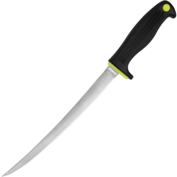 - Kershaw Fillet Fixed 9" knife made from 420J2 stainless steel, satin finish in a trailing point style. Neon accented black Co-Polymer handles with a textured design to provide excellent grip! Comes with included plastic molded sheath with belt loop.