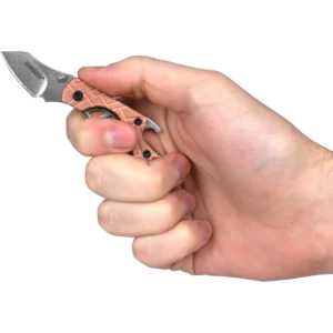 The Kershaw Cinder Copper 1025CUX is small and formidable. The clever design allows you to have a good three-finger grip on the handle. You open the 3cr13 stainless steel blade with the thumb stud. Once opened the liner lock ensures that the blade stays in place. With your thumb on the spine of the blade you have enough control over the blade. This version of the Cinder is enhanced with a copper handle. A tough material that starts forming a patina after some time. As such each knife will be unique. The spacer on this pocket knife, designed by Rick Hinderer, has also been enhanced with a bottle opener. We can conclude that the Kershaw Cinder is an asset to any bunch of keys.