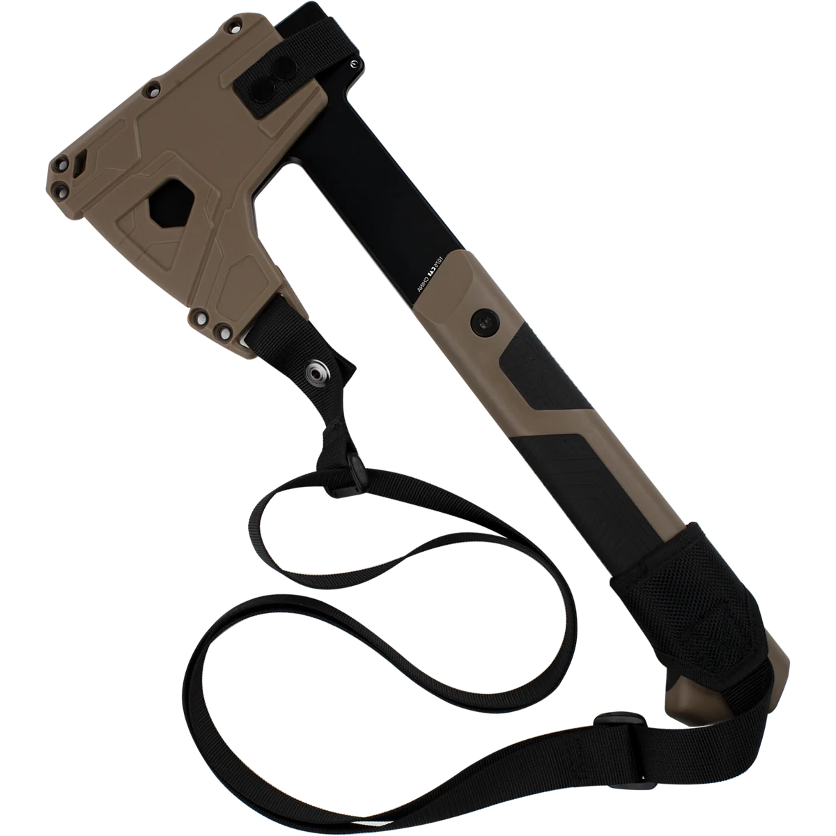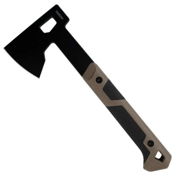 Mankind been using the ax to shape, split, and cut wood for millennia. The Kershaw Dechutes camp ax is an update on that trusty tool. With its angular handle lines and cutouts in the ax head and knob, it has a decidedly contemporary look. The cutouts also help relieve weight in this full-tang tool. The tan glass-filled nylon handle features textured rubberized inserts for secure grip. The cutout in the head is part of the included sheath and carry system. The sheath snaps into place through the hole. Once the sheath is secured, add the strap for convenient over-the-shoulder carry. Cutout in the knob provides a convenient place to add your own wrist strap.