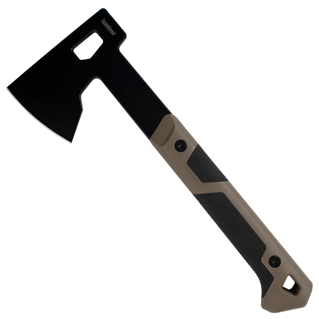 - Kershaw Axe made from 3Cr13 stainless steel with a black oxide coating. Brown GFN handles with black rubber inserts to ensure a secure grip on every swing! Includes a black GFN sheath with shoulder strap for transportation.