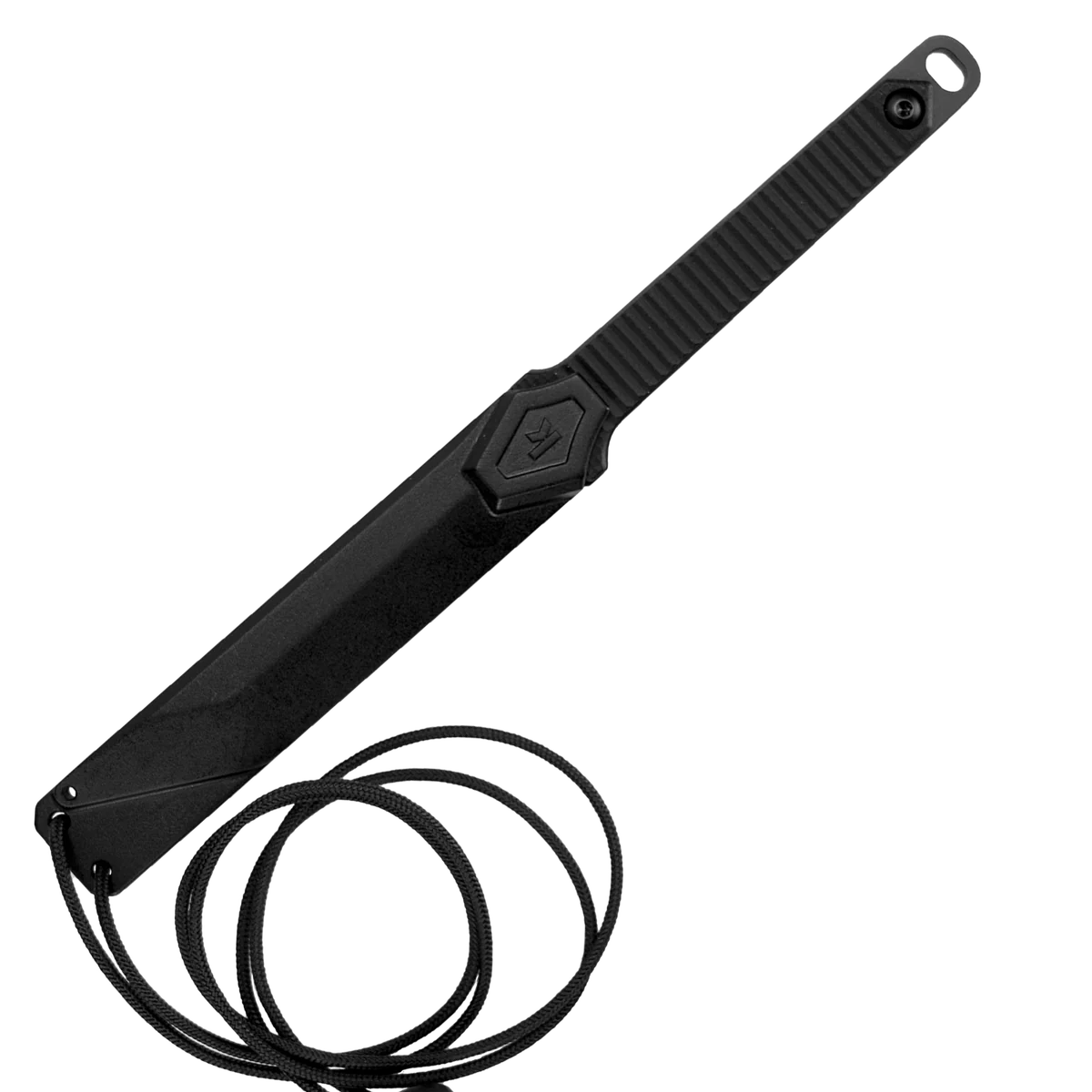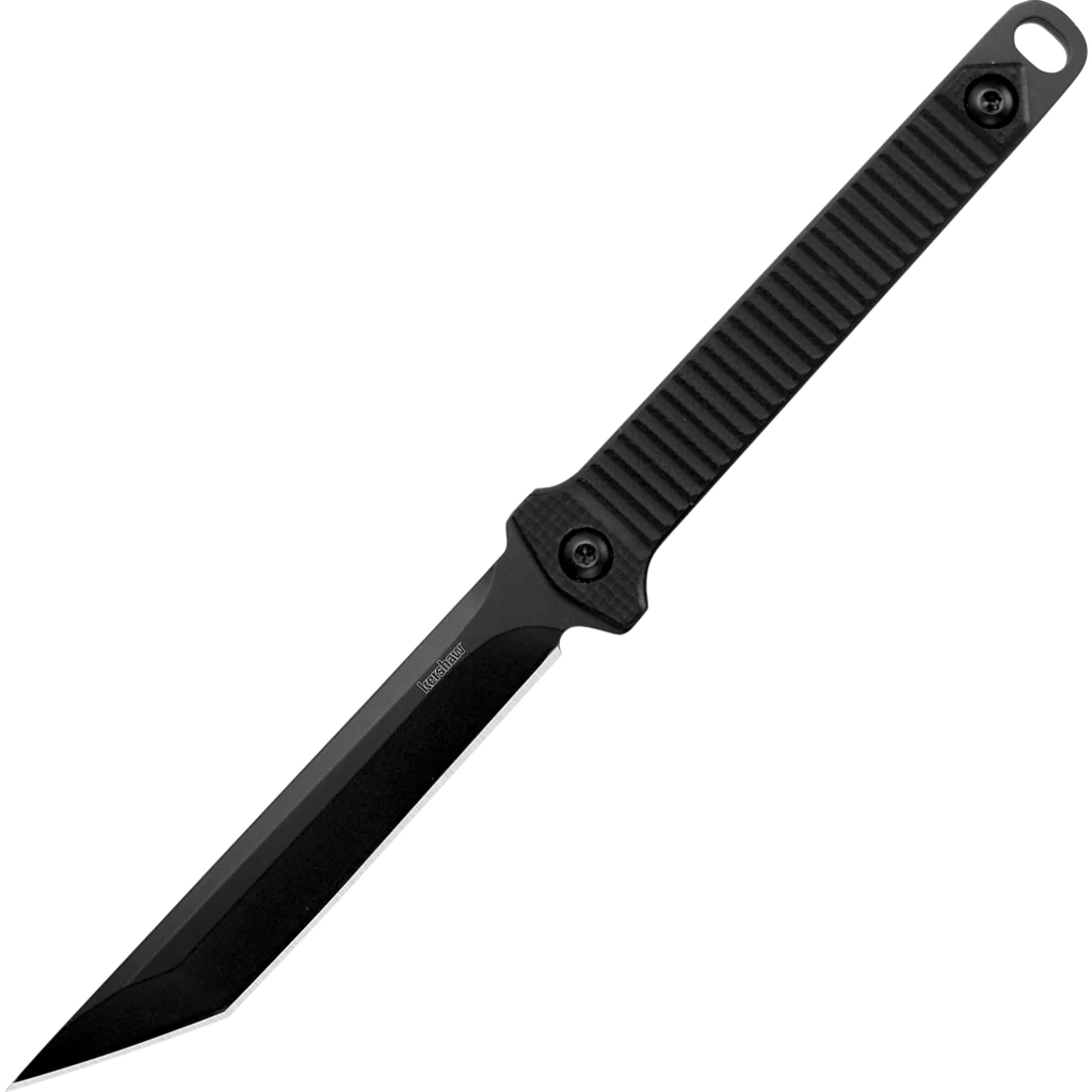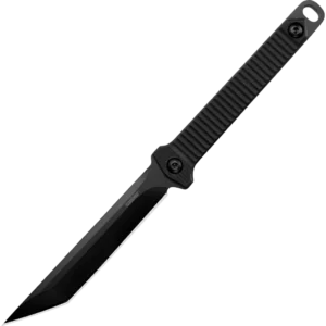 - Full tang fixed blade made from 3Cr13 stailess steel with a black oxide coating in a tanto style. Black textured GFN handle with a lanyard hole. Comes with included molded plastic sheath and lanyard cord for transportation.