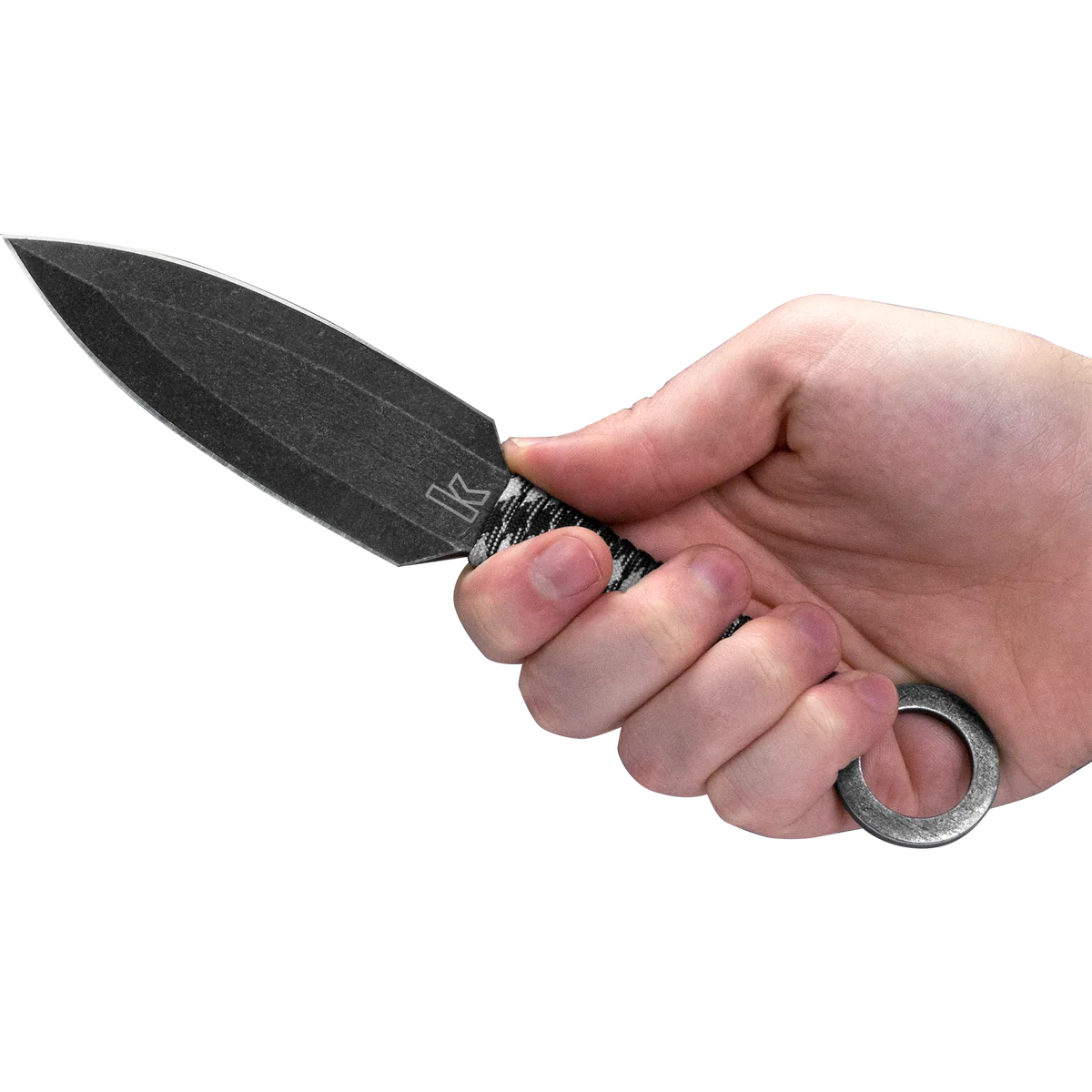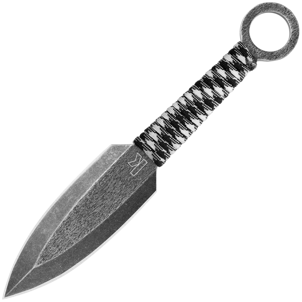 - One piece fixed throwing knife made from 3Cr13 stainless steel with a black wash finish in a spear point style. Grey paracord wrapped handle with large lanyard hole! Comes with included black nylon sheath for easy transportation.