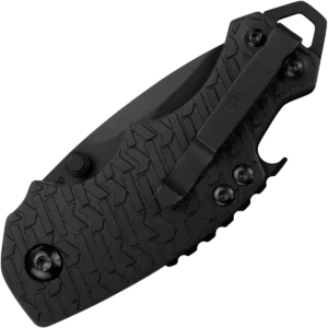 - Folding blade made from 8Cr13MoV stainless steel with a black oxide finish in a drop point style. Black GFN, K-Texture grip handles with built in bottle opener, reversible pocket clip and lanyard hole. Uses a liner lock mechanism.