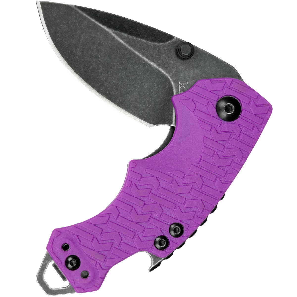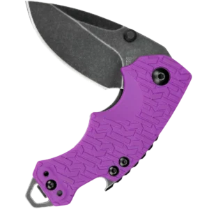 - Folding blade made from 8Cr13MoV stainless steel with a blackwash finish in a drop point style. Purple GFN, K-Texture grip handles with built in bottle opener, reversible pocket clip and lanyard hole. Uses a liner lock mechanism.