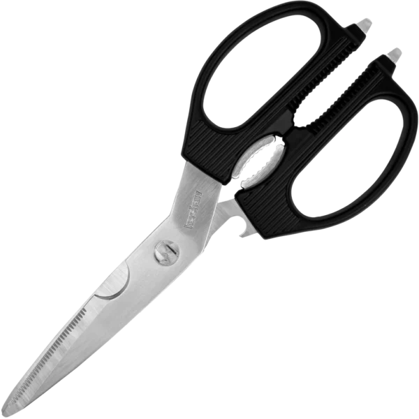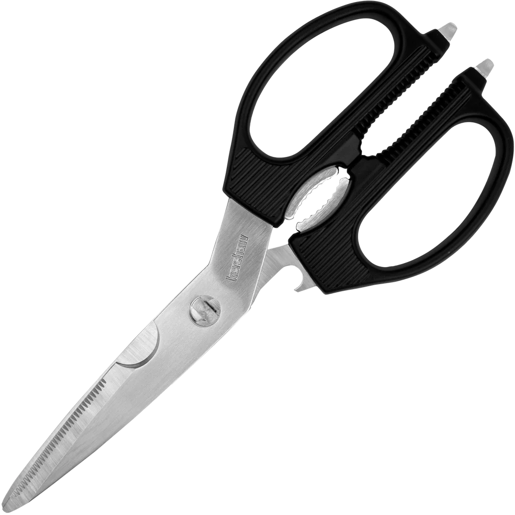 - Kershaw taskmaster shears made from stainless steel with a satin finish. Black GFN handles with built in nutcracker, cap lifter and flat head screwdriver tips!