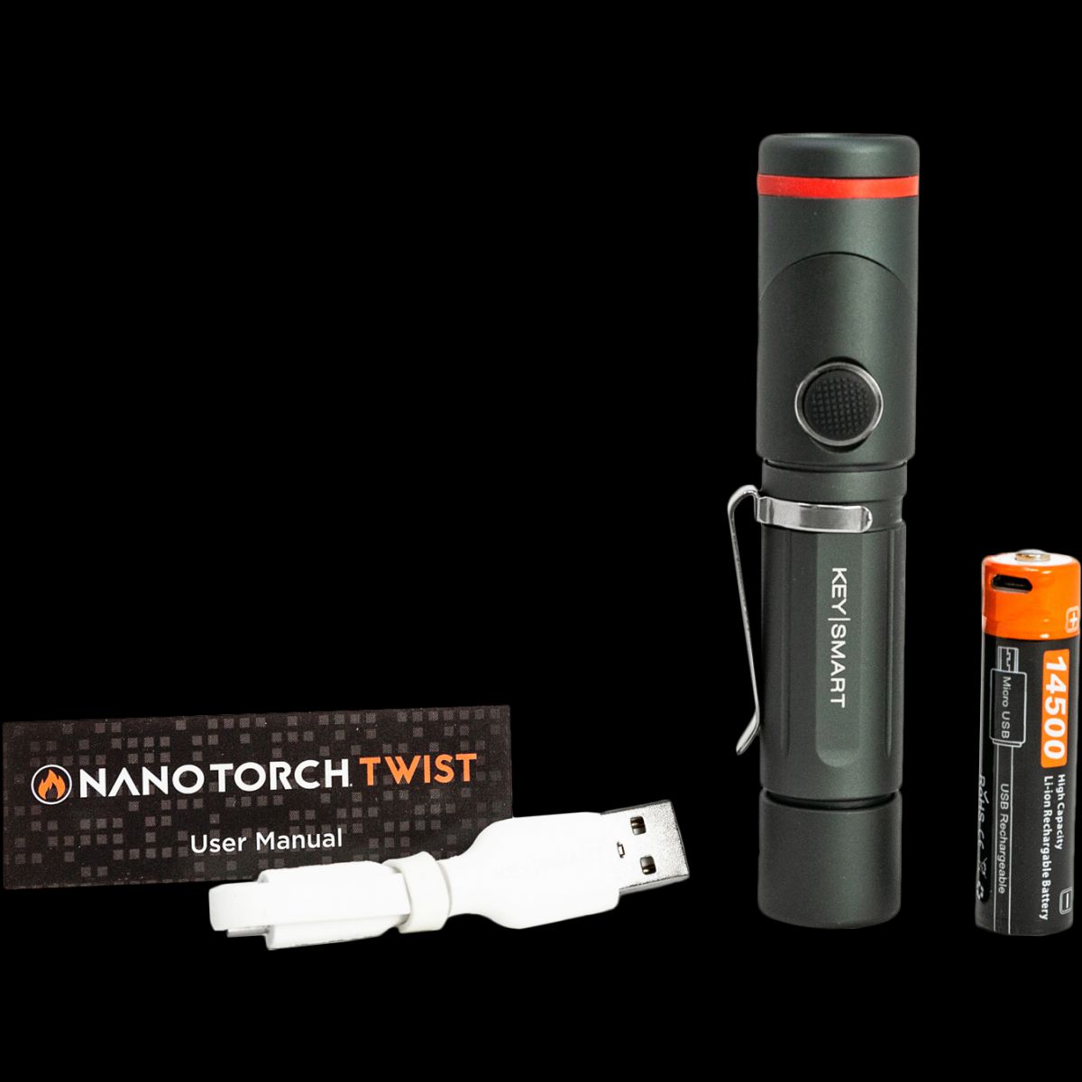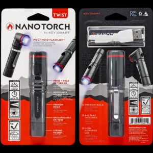 Light up your work wherever you are with the KeySmart Nano Torch 600 lm Twist Flashlight. With 5 brightness settings, you can find the correct amount of light for any situation, and the magnetic base allows you to see hands-free. 90° rotating swivel head can shine light wherever you need it. 600 lm output can be adjusted from high, medium, low, strobe and SOS modes. Memory circuit remembers the last brightness setting each time you turn it on. Magnetic base can provide hands-free light. Durable aluminum design. Estimated 2.5 hours of run time. Requires 1 AA battery (included). Rechargeable battery comes with a Micro-USB charge cable. Removable stainless steel clip can attach to your shirt or bag.