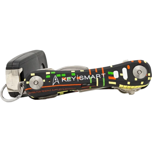 NEVER LOSE YOUR KEYS AGAIN! The KeySmart Compact Pro Smart Location is the ultimate key organiser that gives you a better way to organise and carry your keys giving you peace of mind knowing that your keys are never lost. The KeySmart Pro is small, lightweight and compact, getting rid of all the bulk from multiple keys as it stores up to 10 in an innovative design. This makes all your keys comfortable to carry in your pocket, organised and easy to take anywhere! The KeySmart Compact Pro allows you to track down and find your keys and phone! By downloading the free Tile App you can locate lost keys, make your keys ring so that you can find them quicker around the house and now with the added bonus feature of the KeySmart Pro ringing your phone even when its on silent ensuring you can find your phone if lost- All you do is press the Tile Button! This special edition has a design inspired by Officer Spock. The pattern is a chart of the Officer's Operational Priority Allocations and Protected Distribution Reserve Supplies, and an imprint stating that your keys are "Property of the U.S.S. Enterprise NCC-1701"