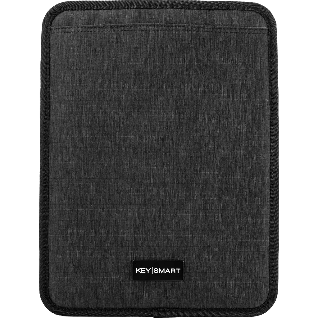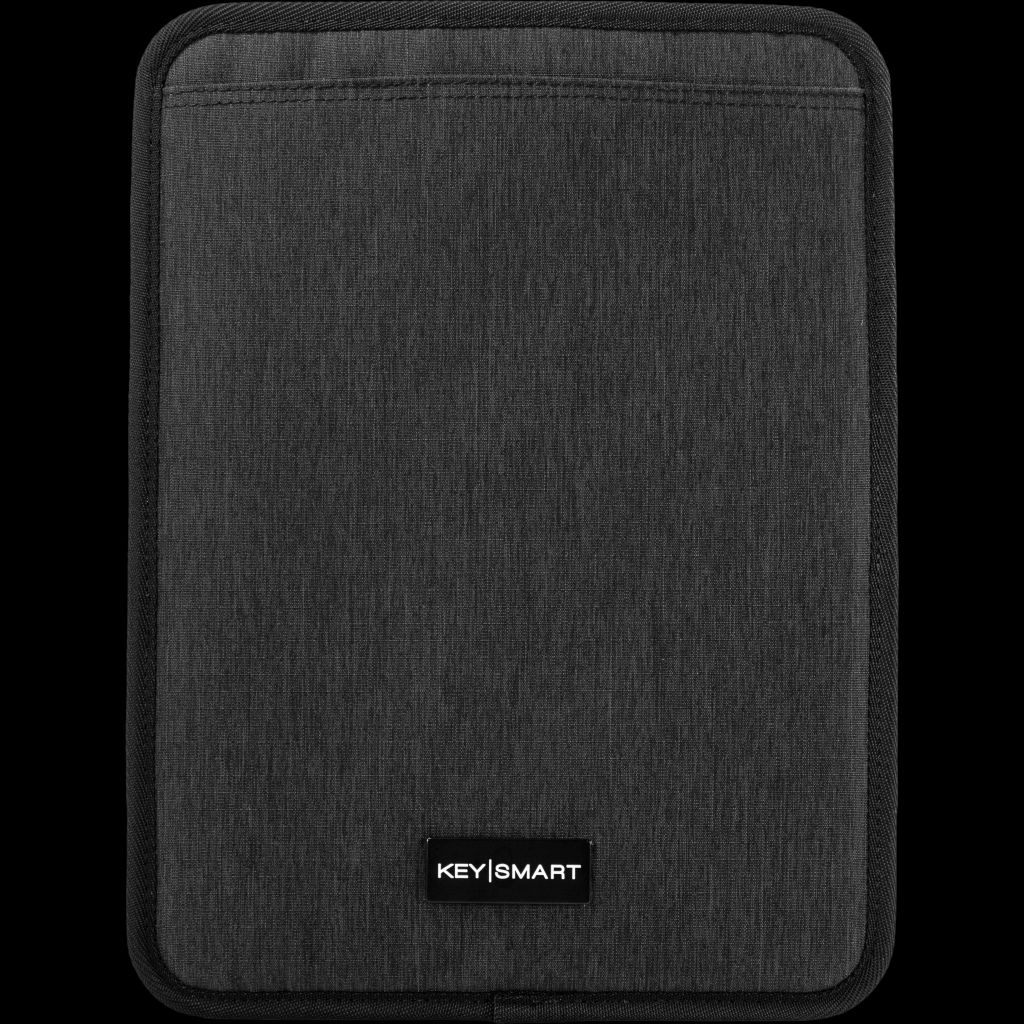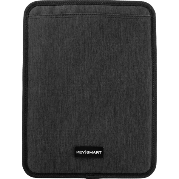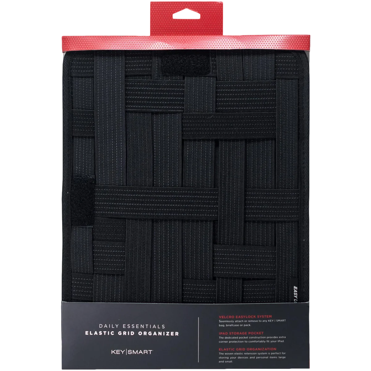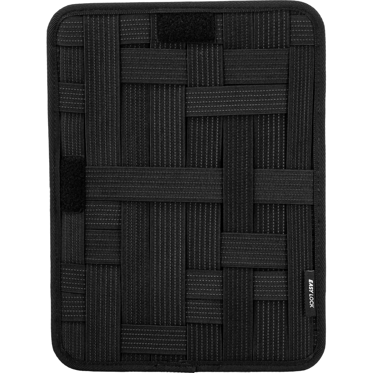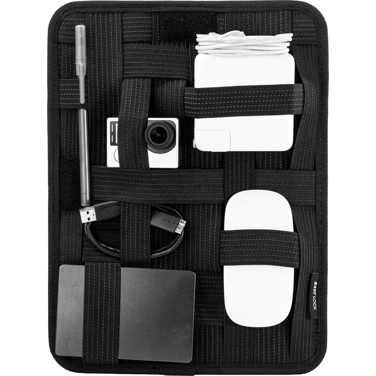 • Grid-like organizer holds an iPad or tablet · Stretchy bands and pockets neatly wrangle cables and chargers.