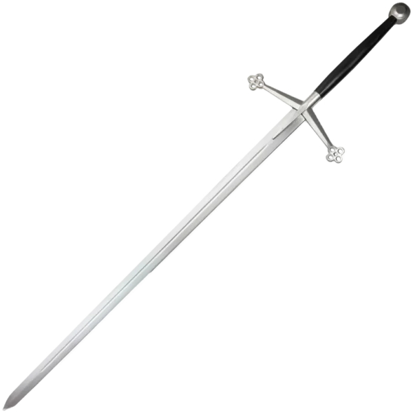 Mainstay of the Highland warriors during the late 15th and 16th centuries, the Claymore sword had a uniquely styled hilt, which set it apart from other great swords of the period. Classic in its design, with distinctive sloping quillons terminating in quatrefoils and a high-collared quillon block with langets following the blade fuller. The Kingston Arms version of the Scottish Claymore is a refined and faithful reproduction of this iconic sword. Unlike some reproductions that can be bulky and out of balance, this version maintains the historical elegance and functionality of the original. The slim grip of the Claymore is leather-covered. Weight: 4lb 4.3oz Point of Balance: 5" Width at Guard: 42.5mm Thickness at Guard: 5.3mm Thickness at Tip: 2.2mm