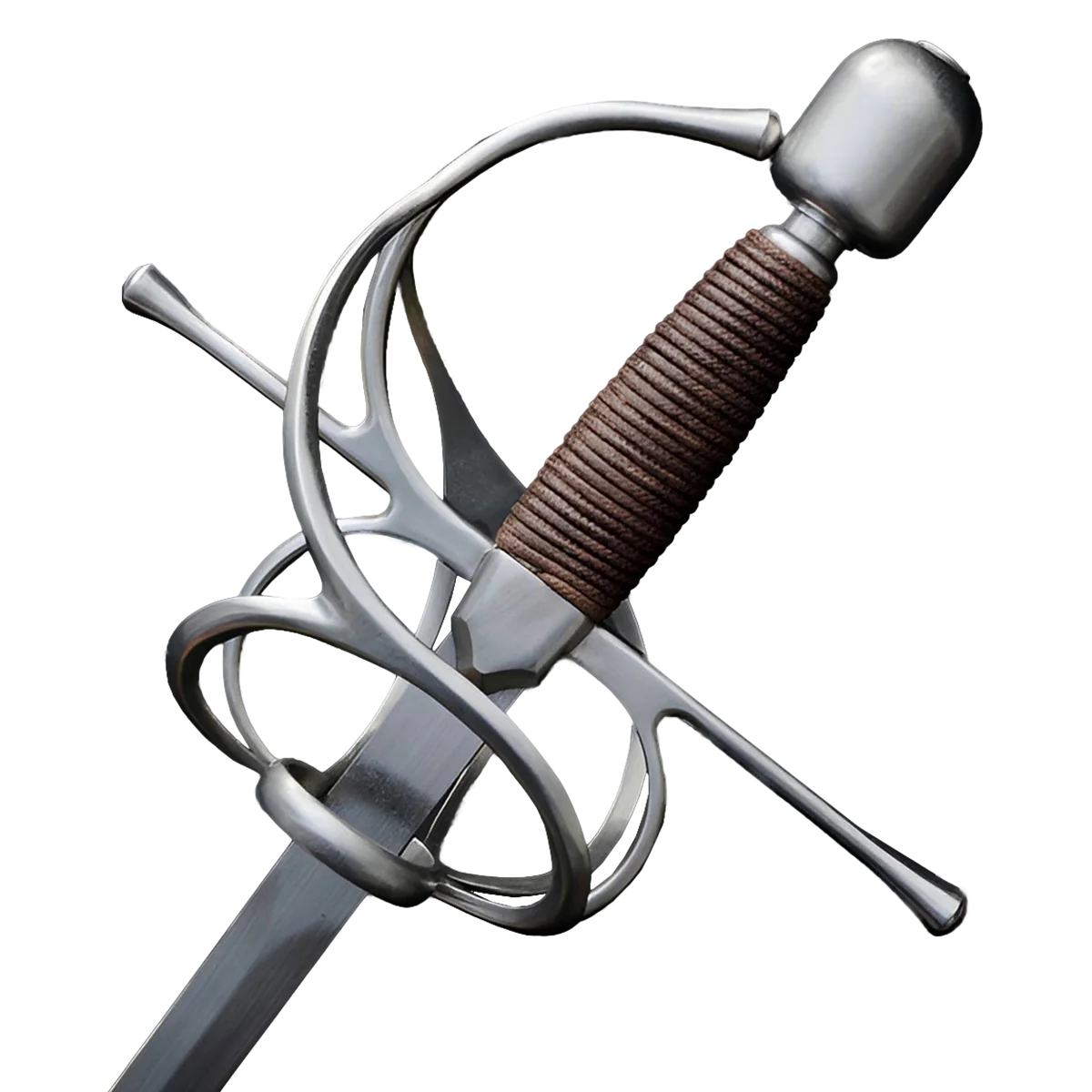 Renaissance-style rapiers trace their origins to early 17th century Europe, where swordplay with the rapier was considered an essential part of a gentleman’s education and was often used in resolving gentlemanly disagreements. Blades generally originated in one of the blade making centers such as Toledo or Solingen, but many differences in styling and hilt materials resulted from the local manufacture of hilts all over Europe. The Kingston Arms Rapier features improvements on the guard design where it joins the blade for more strength and reenforcement for the thrusts. The stainless steel guard and pommel are matte finished. The brown cord wrapped grip is comfortable in the hand and leaves enough space to wear fencing gloves if desired. Weight: 2 lbs Point of Balance: 2 5/8" Width at Guard: 0.75" Thickness at Guard: 5.5mm Thickness at Tip: 2.5mm