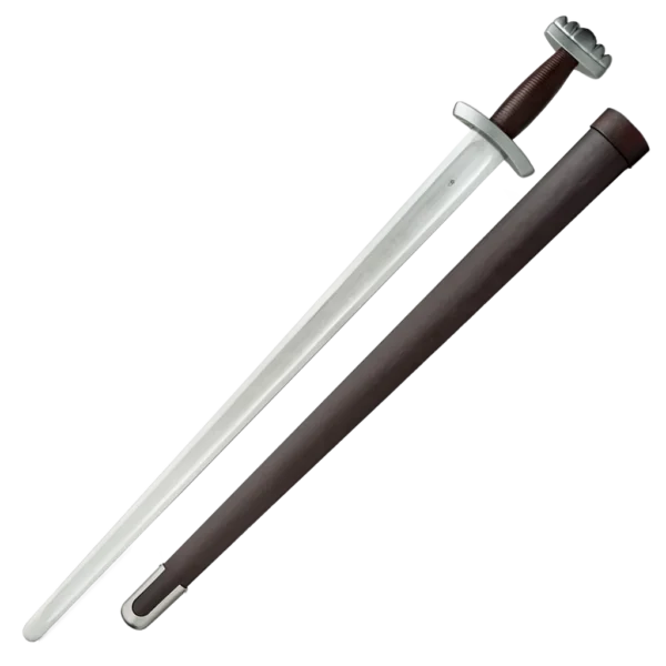 Features like thru-tang handle construction, peened stainless steel pommel and guard, 0.07" rounded edge thickness make this a great prop accessory. The cord wrapped leather grip feels exceptional in the hand with an oval cross section and slight barrel shape to keep fatigue at bay. The grip is large enough to accommodate armored hands. A respectable fuller runs the length of both pieces to lighten and counter balance the sword overall. A wood core and leather wrapped scabbard tipped with a stainless chape comes with each sword. The blade is forged from 9260 spring steel and is tempered to around 50HRC, providing a long lasting sword. The guard needs special mention, featuring the King-Peen system. King-Peen is essentially a steel tab on the guard under the grip that is pinned through the tang of the sword. The process keeps the guard from going loose after a lengthy campaign without compromising the strength of the hilt. The pommel is pressed into place and hot peened. Combine these two processes and you get a sword that rings like a bell when struck.