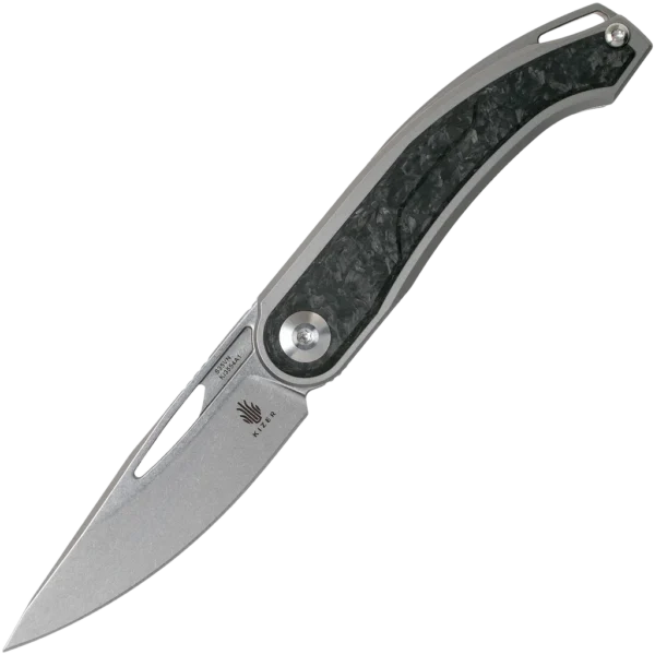 The Kizer Apus frame lock folding knife was designed by Henar. This model has a satin finished blade and a blasted titanium handle with carbon fiber scales. The Apus is a front flipper knife with a sleek, modern design. It has a titanium frame lock that secures the clip point, CPM-S35VN blade. The spine of the blade has two section of jimping, allowing for a more sure grip. The titanium pocket clip is set up for tip-up carry, and the backspacer features a lanyard hole.