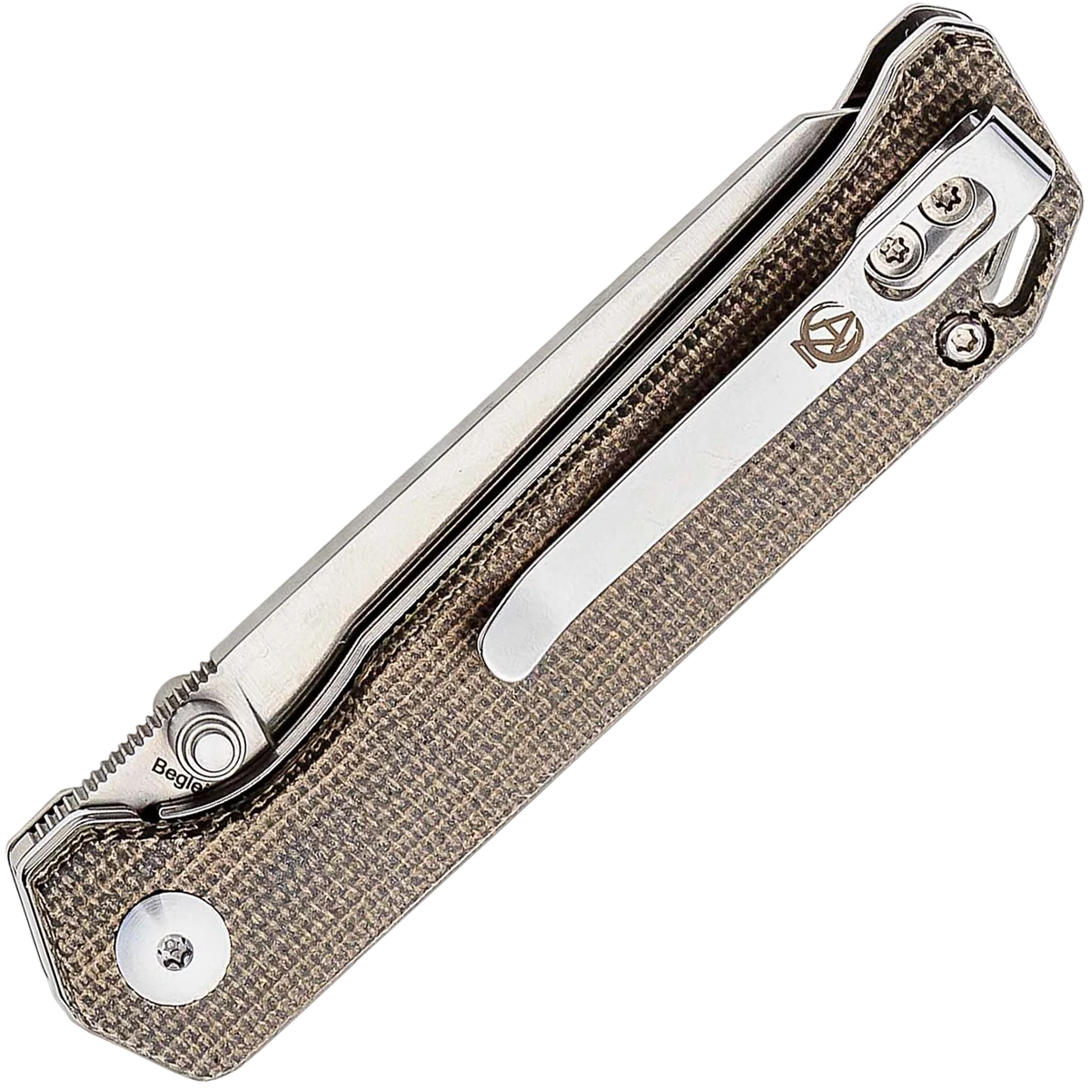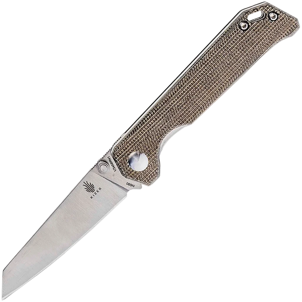 A pocket friendly version of the original, the Kizer Mini Begleiter has all the great features of its big brother, just on a smaller scale. The EDC-ready design has a satin finished N690 reverse tanto blade that is easy to open with dual thumb studs and has smooth and reliable action thanks to a caged ball bearing pivot. The greyish green micarta scales are grippy and also have a great look contrasted with the satin finished hardware.