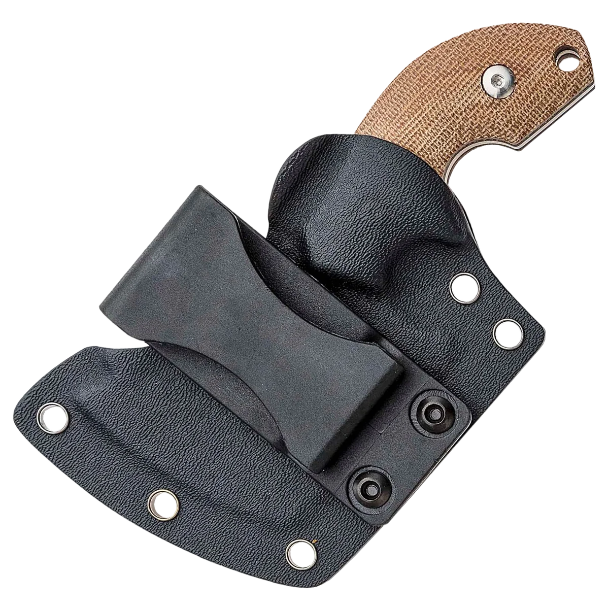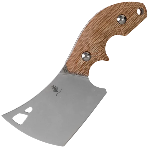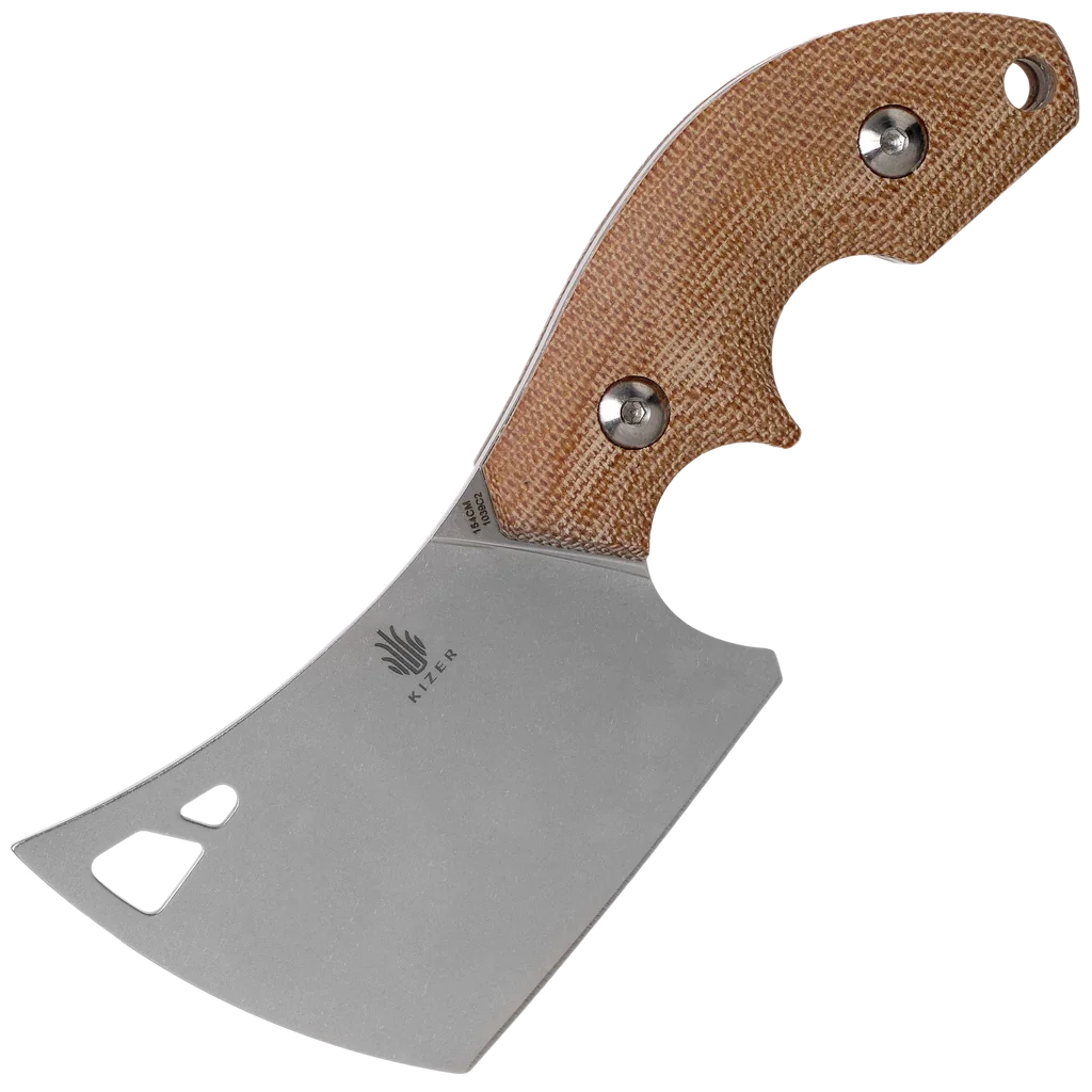The Kizer Butcher is a compact fixed blade cleaver designed by Eddie Diaz of Macho Blades. The blade is just 2.5" with an overall length of 5.67". The cleaver-style blade has a unique upswept spine to give a unique look. The fit and finish of the Micarta handle scales are excellent with pronounced finger grooves for a secure, comfortable grip. The included coyote tan molded Kydex sheath includes a horizontal carry belt clip for easy carry. Kizer uses high-tech wire EDM machines to cut the parts. This method is slower than laser or waterjet but Kizer feels the quality is worth the wait. Each component in Kizer knives is precision machined and engineered to the finest tolerances. The final fit, finish, action, and sharpness of each knife is achieved entirely by hand, employing the irreplaceable craftsmanship developed by generations of cutlery masters. Dedicated craftsman honoring the long-term goal of making the best knives possible is what Kizer brings to you.