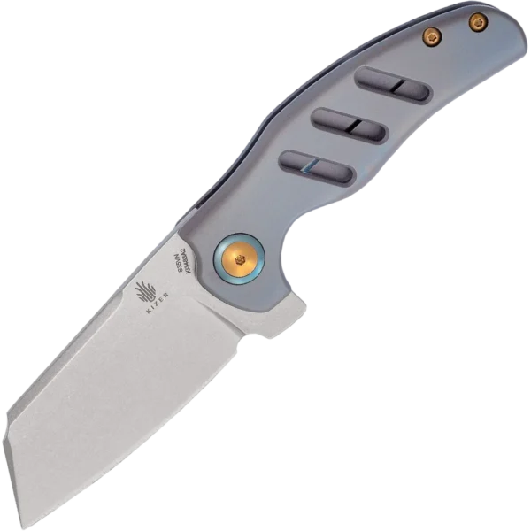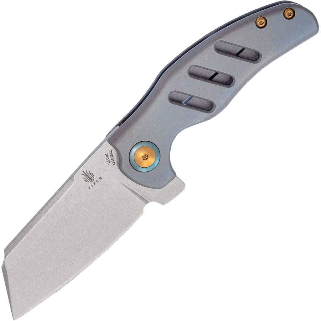 The Ki3488A2 Mini c01c folding knife by Kizer Cutlery is a collaborative project between Kizer and Sheepdog Knives custom knifemaker Chris Conaway. It's a production version of his awesome custom design, manufactured with superior quality and premium features. It's an ideal sized EDC folder that gives you the beefiness of a Sheepdog Knife in a more compact and competitively priced package. The 2.64" sheepsfoot blade is made from S35VN stainless steel with a wide cleaver-style shape perfect for a variety of utility tasks. The bearing pivot system allows for smooth blade opening, as with all Kizer knives. The full titanium handle is a wonder of ergonomics, it really contours to each and every curve of the hand with milled slots for looks and weight reduction. It features a custom pivot and pivot collar, a lockbar overtravel prevention mechanism, replaceable steel insert, and is an excellent knife built with a quality anyone can appreciate.