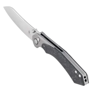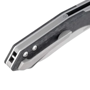 Striking collaboration from Paul Munko / Colorful Filth with Kizer Knives. The handle is built from a stainless steel frame with titanium scales and features beautiful "shredded carbon fiber" inlays. The blade is made from premium CPM S35VN stainless steel and has a semi-sheepfoot style. It features a fine stonewash finish. Opening the knife is easy and fast with the thumb studs. Unlocking the blade is easy with the button lock. The pivot features ceramic ball bearings for an extremely smooth blade action.