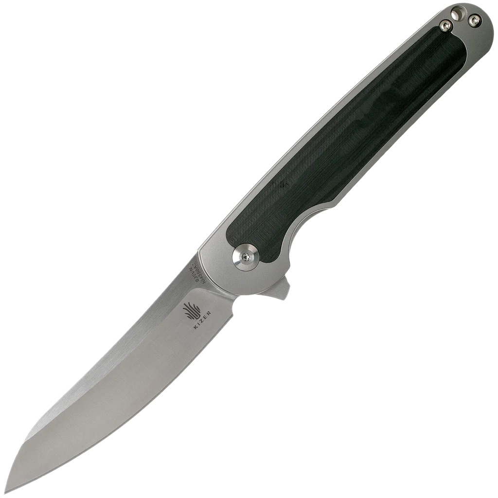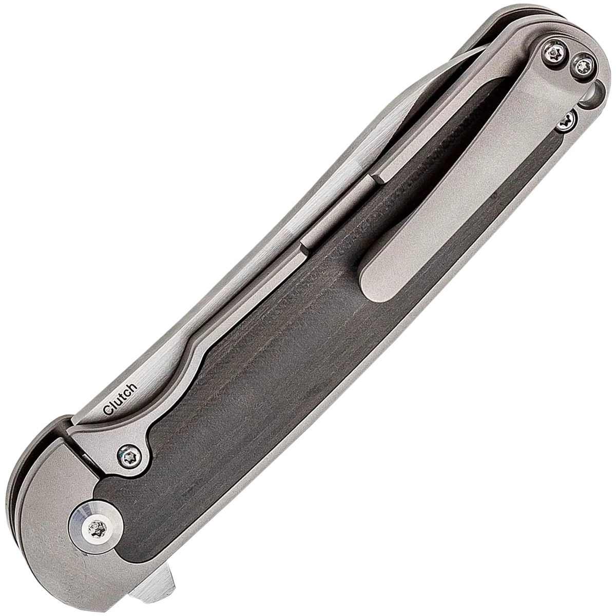 The Kizer Clutch, designed by Carlos Elstner, is a modern flipper knife with wonderful action and a smooth, comfortable build. It boasts a titanium frame with a smooth carbon fiber inlay on either side. The blade, secured by a steel-tipped frame lock, is in a modified trailing point style with a satin finish. The blade is made from CPM-S35VN stainless steel, which allows for ease of sharpening as well as great edge retention and toughness. It includes a titanium pocket clip for secure tip-up carry. The Clutch has no hot spots, great materials, and some seriously addictive flipper action.
