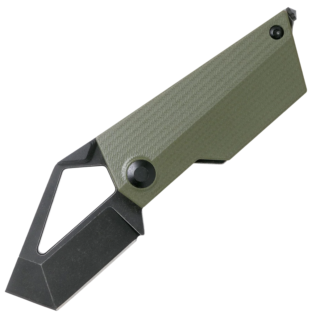 The Kizer CyberBlade Green G10 Ki2563A1 is a robust pocket knife, designed by Yue. The first thing you notice is the angular and futuristic design. It is safe to say that there is no other identical knife. At first the CyberBlade might appear to be too difficult to handle. Nothing could be further from the truth. The royal thumb hole and the artistic thumb stud turn opening the knife into child's play. Great if you wear gloves on a daily basis! Because of the high handle you always have an amazing grip over the knife. Despite its smaller size. The tanto-style blade is great for daily tasks for which you need a strong tip. The blade is made from M390. A premium type of steel that retains its sharpness well. One of the most popular types of steel at the moment. The blade is enhanced with a cool black coating and, when opened, the blade is locked by a solid liner lock. The handle and the thumb stud are made from stunning green G10. The end of the handle is enhanced with a glass breaker.