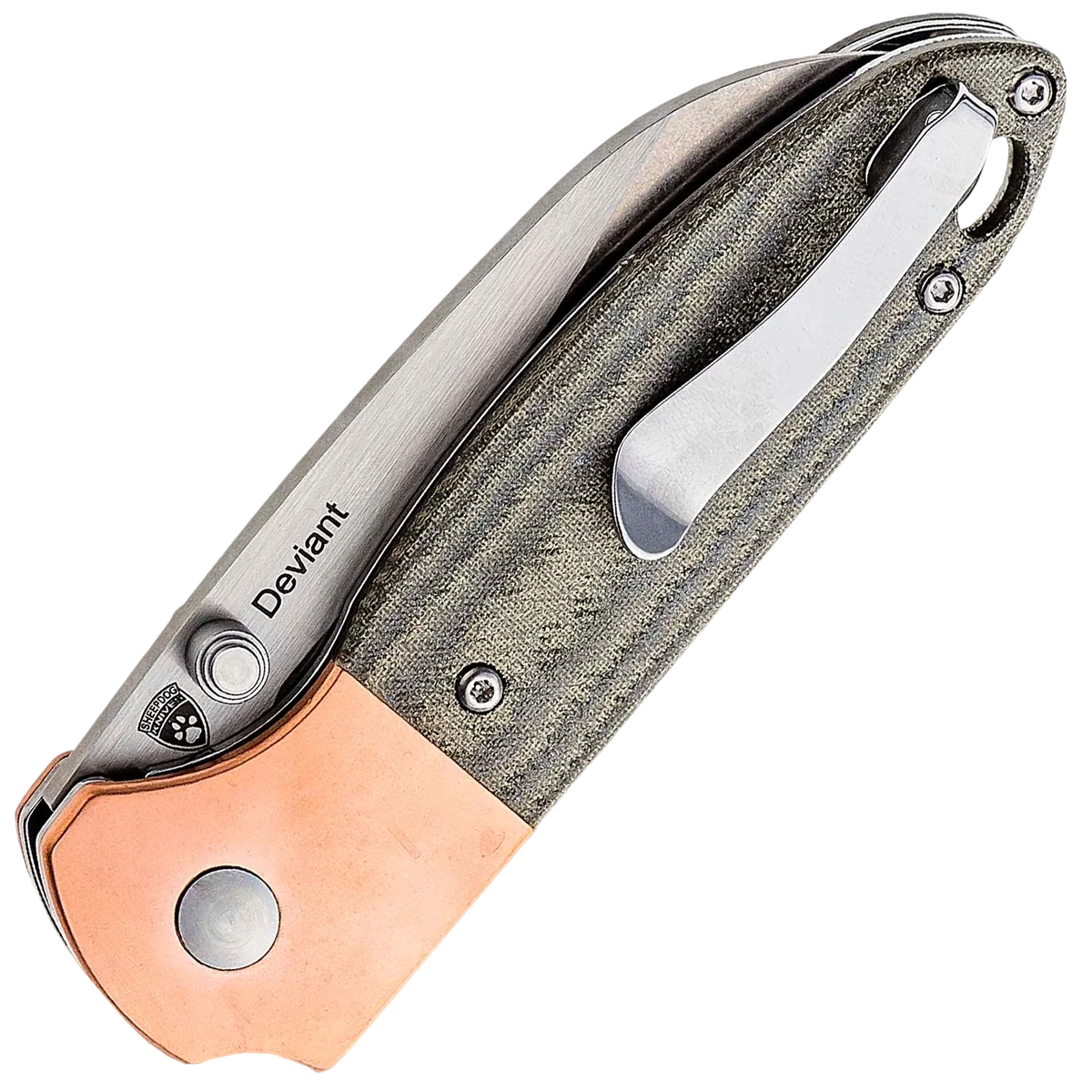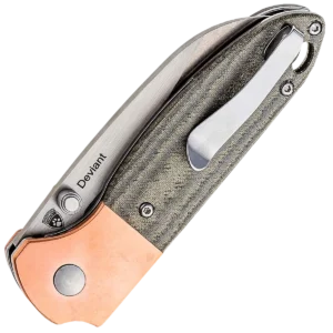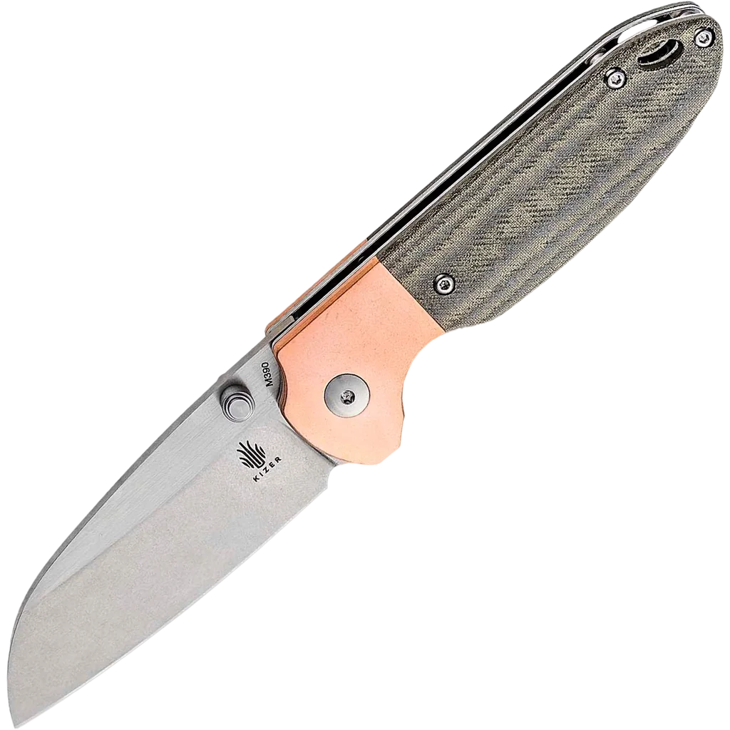 The V3575A1 Deviant folding knife by Kizer Cutlery is a collaborative project between Kizer and Sheepdog Knives custom knifemaker Chris Conaway. It's a production version of his awesome custom design, manufactured with superior quality and premium features. The 3.04" sheepsfoot blade is made from M390 stainless steel with a wide cleaver-style shape perfect for a variety of utility tasks. The bearing pivot system allows for smooth blade opening, as with all Kizer knives. The micarta handle is a wonder of ergonomics, it features a raw copper bolster that really provides a nice offset to the green of the rest of the handle. It features a ball-bearing pivot system, a sturdy liner lock, and is an excellent knife built with a quality anyone can appreciate. Kizer uses high-tech wire EDM machines to cut the parts. This method is slower than laser or water jet but Kizer feels the quality is worth the wait. Each component in Kizer knives is precision machined and engineered to the finest tolerances. The final fit, finish, action, and sharpness of each knife are achieved entirely by hand, employing the irreplaceable craftsmanship developed by generations of cutlery masters. Dedicated craftsman honoring the long-term goal of making the best knives possible is what Kizer brings to you.