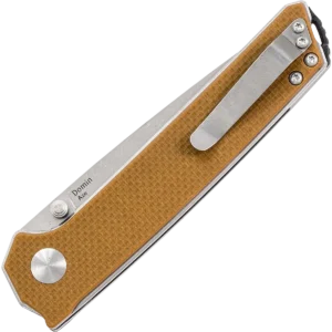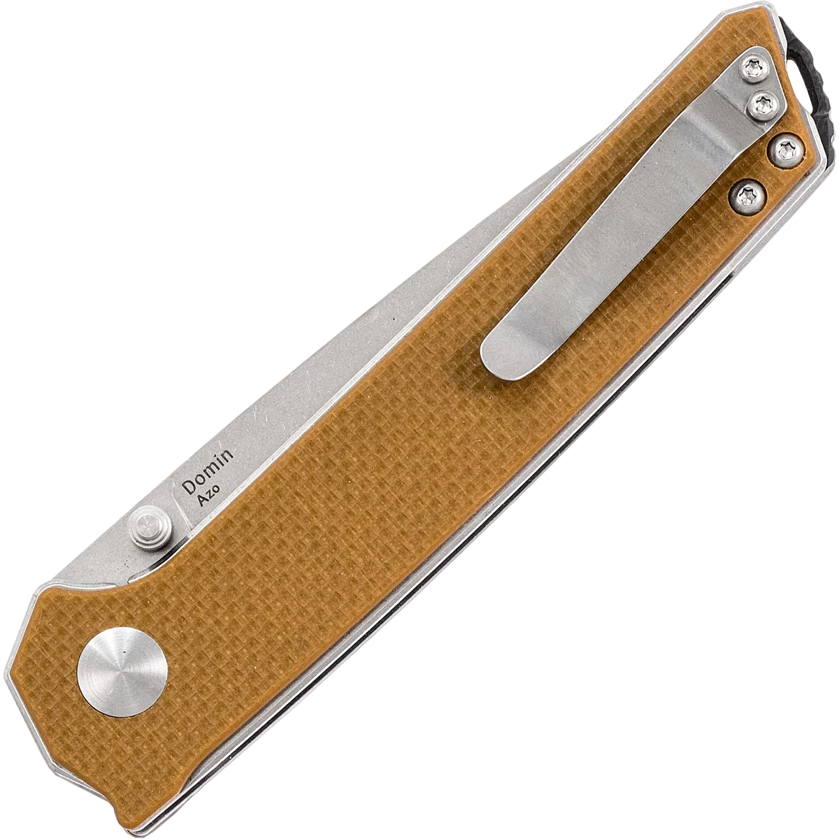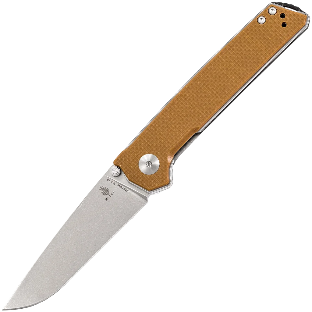 The Kizer Domin model V4516A4 is built with a 3.46" stonewashed VG-10 drop point blade and a brown G-10 handle. VG-10 steel is a stainless type of steel from Japan. It retains its sharpness well and is easy to sharpen. The Kizer Vanguard Series Domin offers a practical EDC design free from unnecessary embellishments. Its handle is outfitted with textured G-10 scales, stainless steel liners, and a subtle G-10 backspacer with a built-in lanyard hole. The Domin comes with a stainless steel pocket clip for tip-up everyday carry.