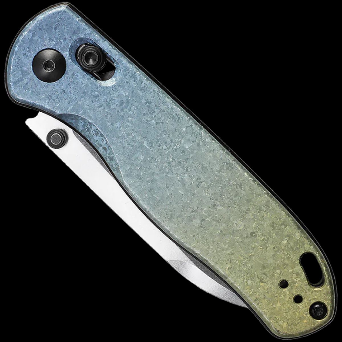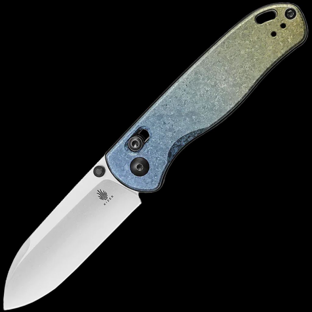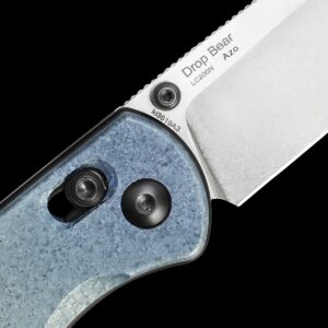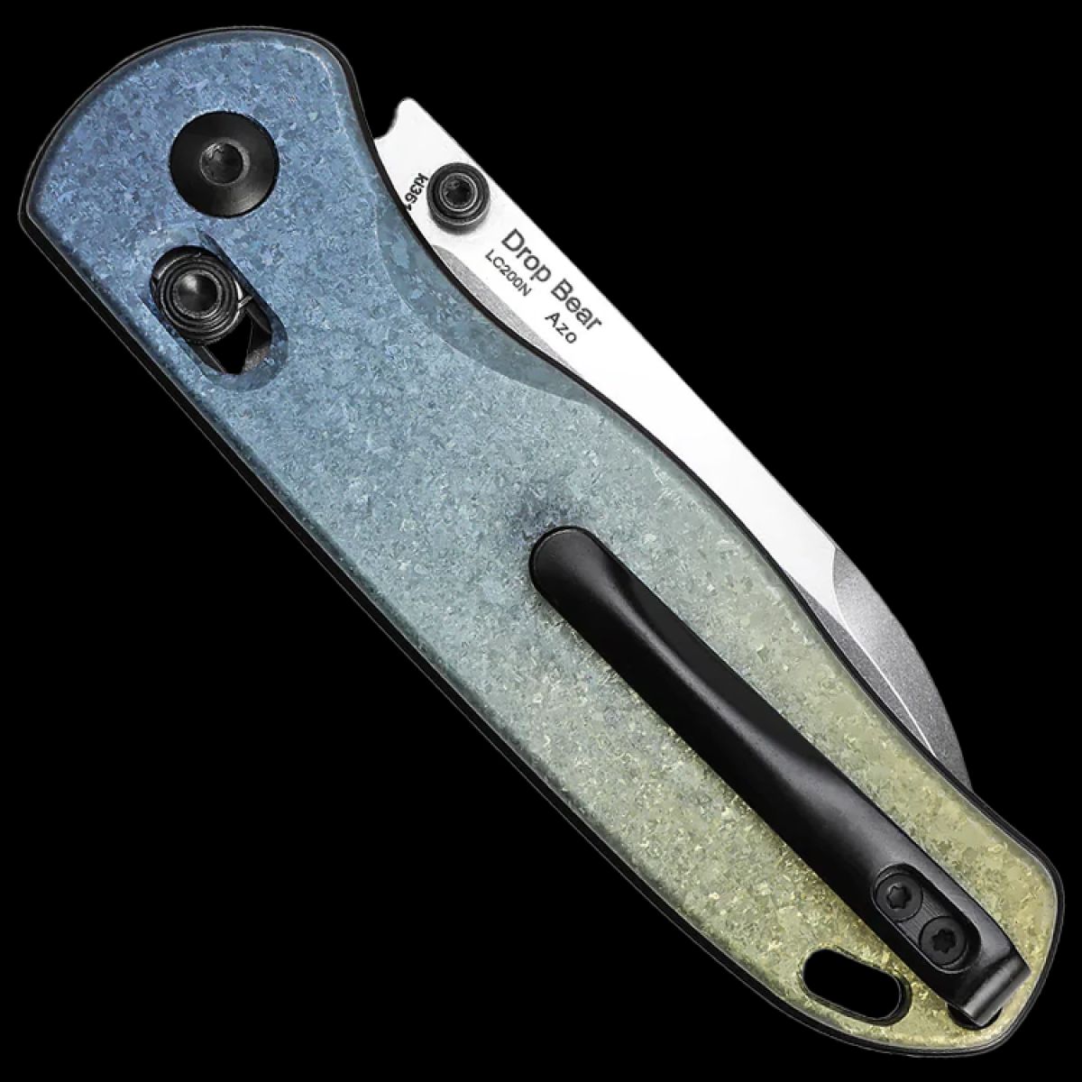 Premium version of this popular compact folder with the new "Clutch lock". It can be operated equally easy by left or righthand users! The handle is built from a stainless steel frame with black PVD coating. All screws, pivot and pocket clip feature the same PVD finish. The frame is covered with scales from titanium that feature anodized colors fading from blue to gold. The blade is made from premium LC200 stainless, has a flat grind and a fine stonewash finish. Opening the blade is easy with the thumb studs or simply by pulling back the lock and swinging out the blade. The use of ball bearings ensures extremely smooth blade action. The deep-carry pocket clip can be positioned left or right, tip-up, making the Drop Bear a fully ambidextrous companion!