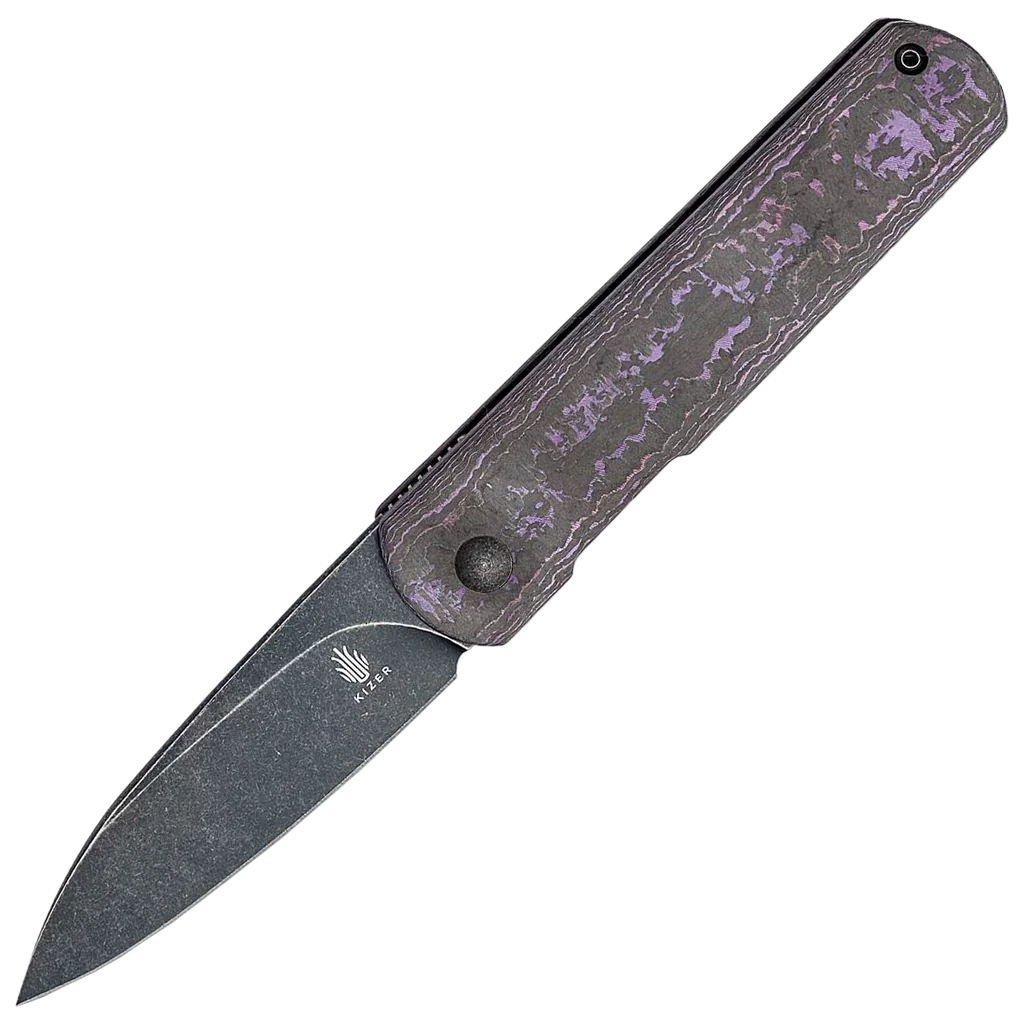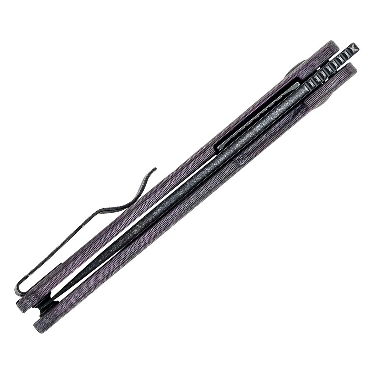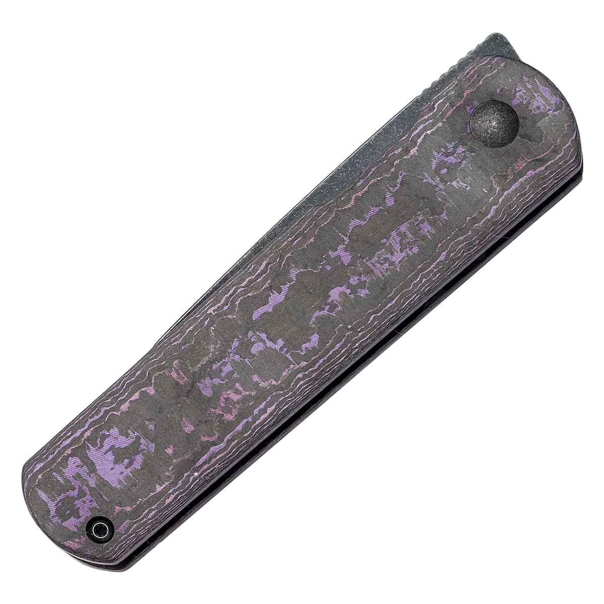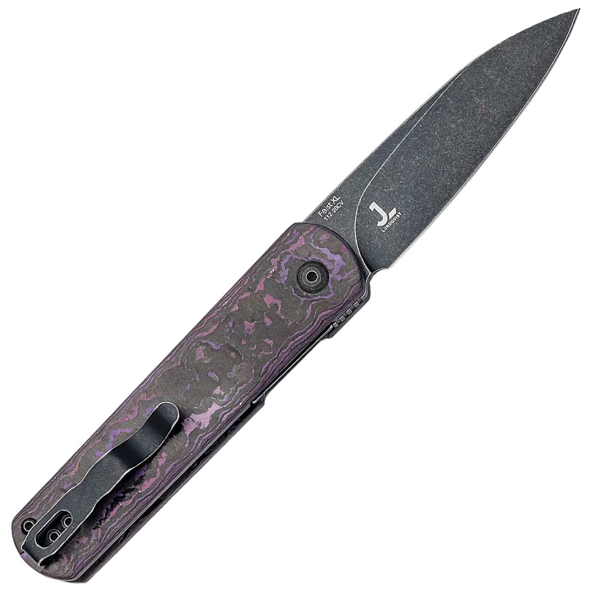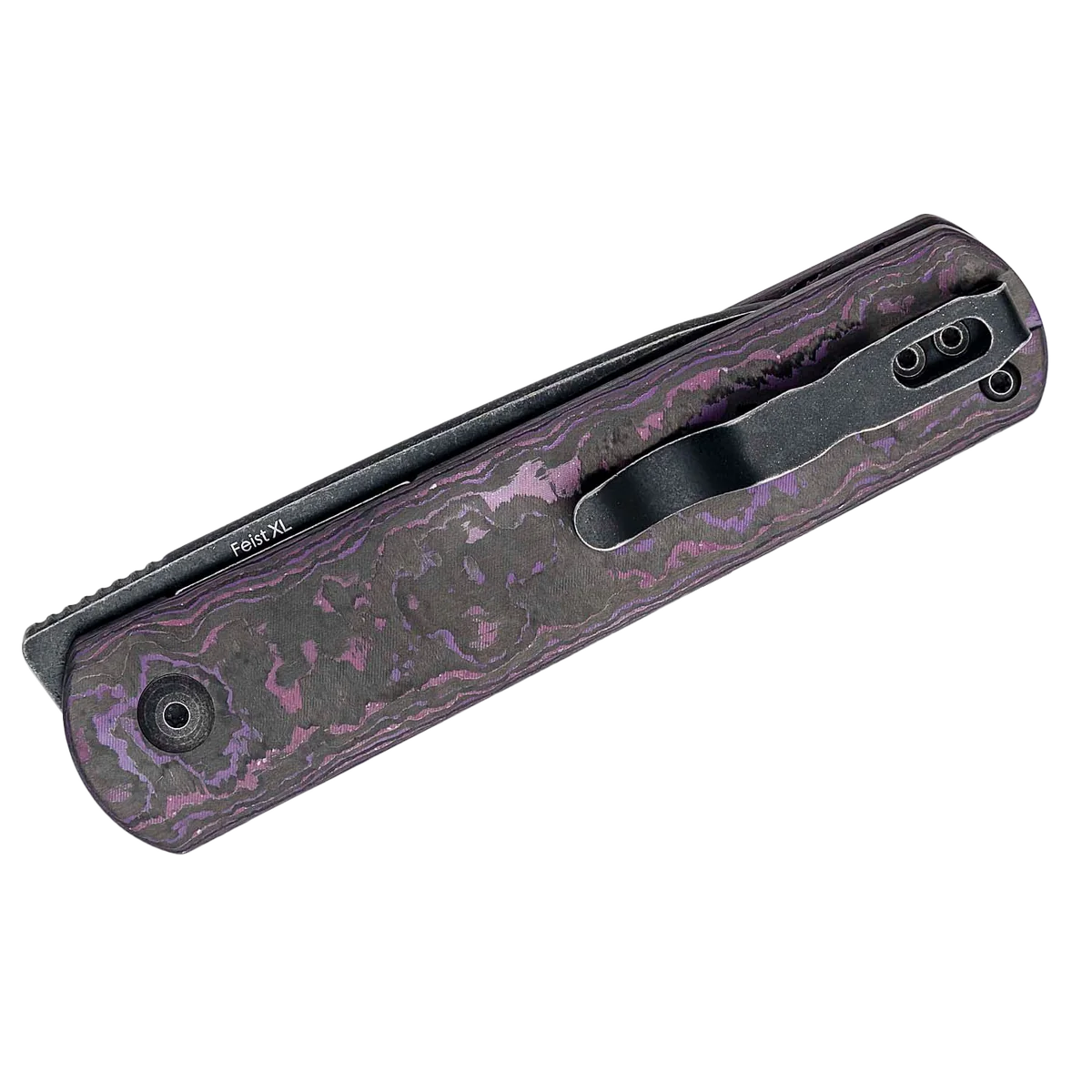 The Feist XL is designed as an enlarged version by Justin Lundquist. This is a new design, meeting your practical and aesthetic needs at the same time. It utilizes 20CV steel blade and Fatcarbon handle. 20CV steel is a very hard steel with great wear resistance and is easy to sharpen. The 20CV steel blade is strong and holds an edge exceptionally well. The unique purple patterns on the handle give the knife a fashionable look. You'll be amazed at what this knife can do!