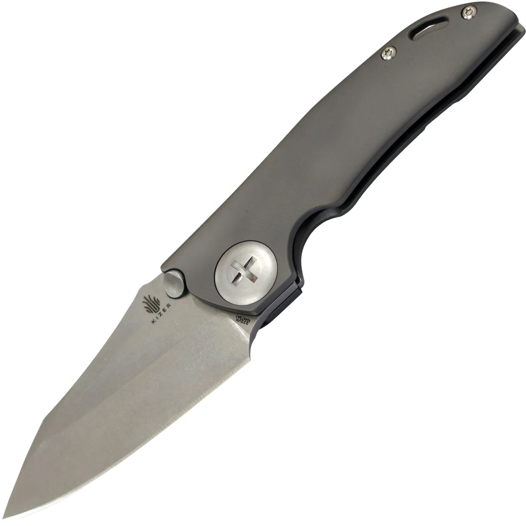 This Kizer GPB1 offers a rugged John Gray design that is perfectly suited for outdoorsmen and knife enthusiasts. GPB1 stands for Gray's Pocket Brute #1, and this powerful knife is true to it's name. The large wharncliffe style blade has a plain edge with a grind positioned below the handle grips. Perfect for a wide range of cutting tasks you will love the feel of the GPB1. The curved handle is made from titanium and comes equipped with a titanium pocket clip, lanyard hole and a custom pivot. With an elegant look and a rugged EDC design, that GPB1 is destined to be your constant companion.
