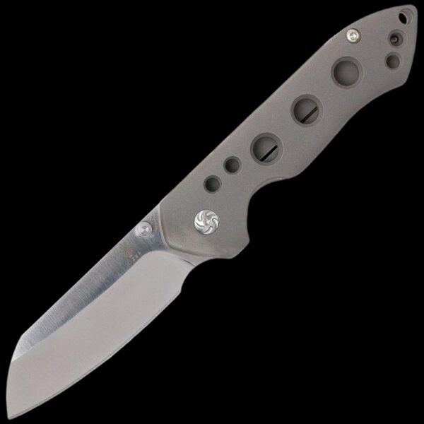 - This Guru model is outfitted with a thumbstud opener and a titanium handle with a milled hole design.