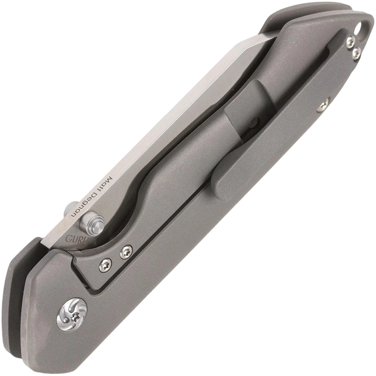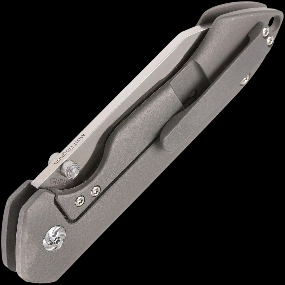 - This Guru model is outfitted with a thumbstud opener and a titanium handle.