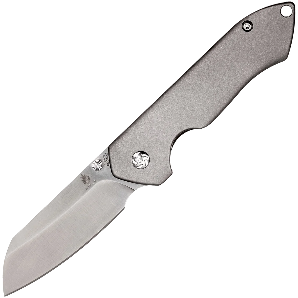 The Ki3504A Guru by Kizer Cutlery is a collaborative project between Kizer and custom knifemaker Matt Degnan. The design is based on his custom "MC" model, named after his friend Matt Cucchiara who has been his mentor along the way, with an added lanyard hole. It's available in both flipper and thumb stud versions, with or without the milled holes, to meet your specific preference. The 3" CPM-S35VN stainless steel blade has a utilitarian sheepsfoot shape and finger choil for detail work. This folder has a very streamlined look with a comfortable feel in the hand and in the pocket. The bearing pivot system allows for smooth blade opening, as with all Kizer knives. The matte gray finished titanium handle is slim and very ergonomic with every surface and every edge being contoured for comfort. It features a replaceable steel insert with overtravel arrestor and comes with a milled titanium pocket clip. This is a great sized folder for everyday carry and is built with a quality anyone can appreciate.