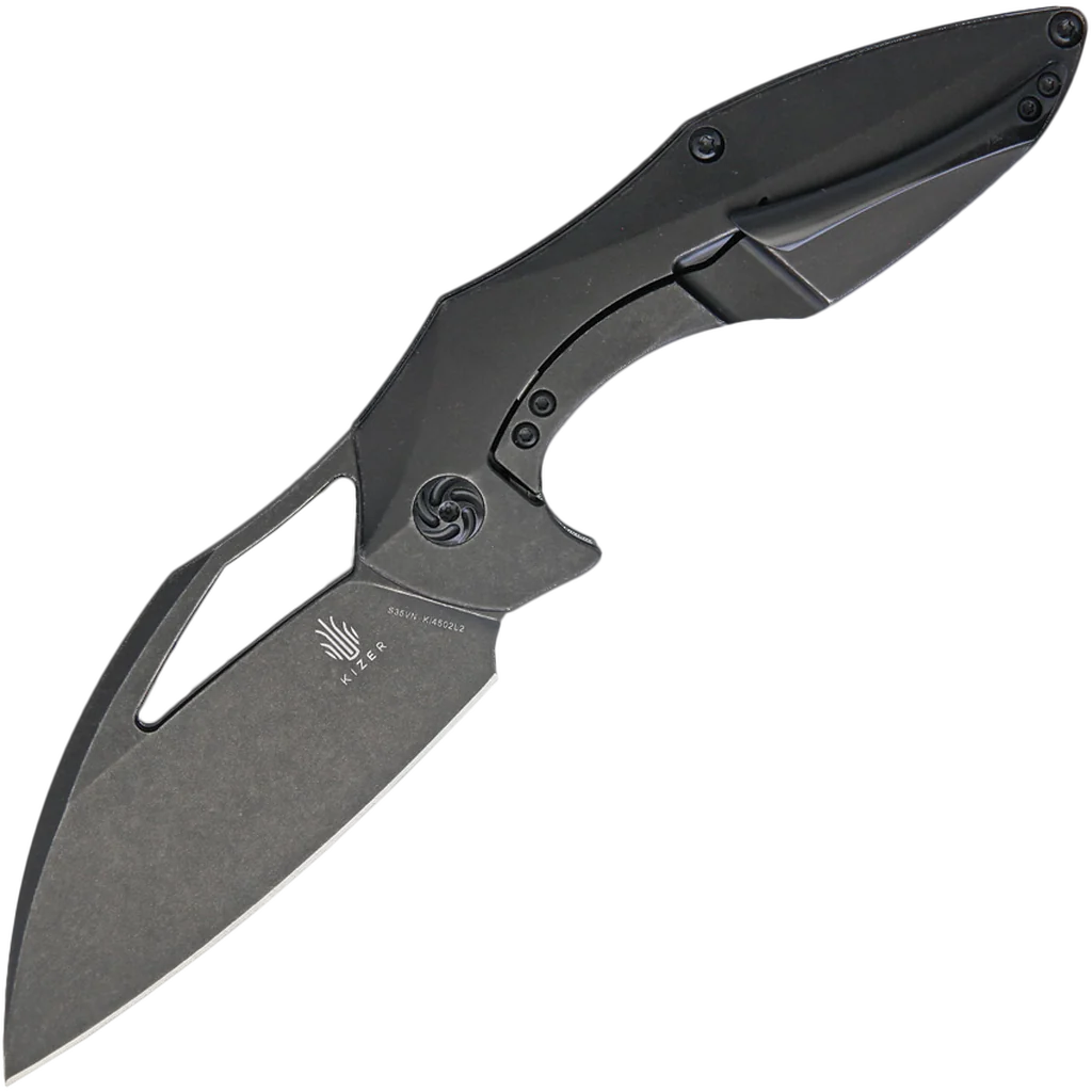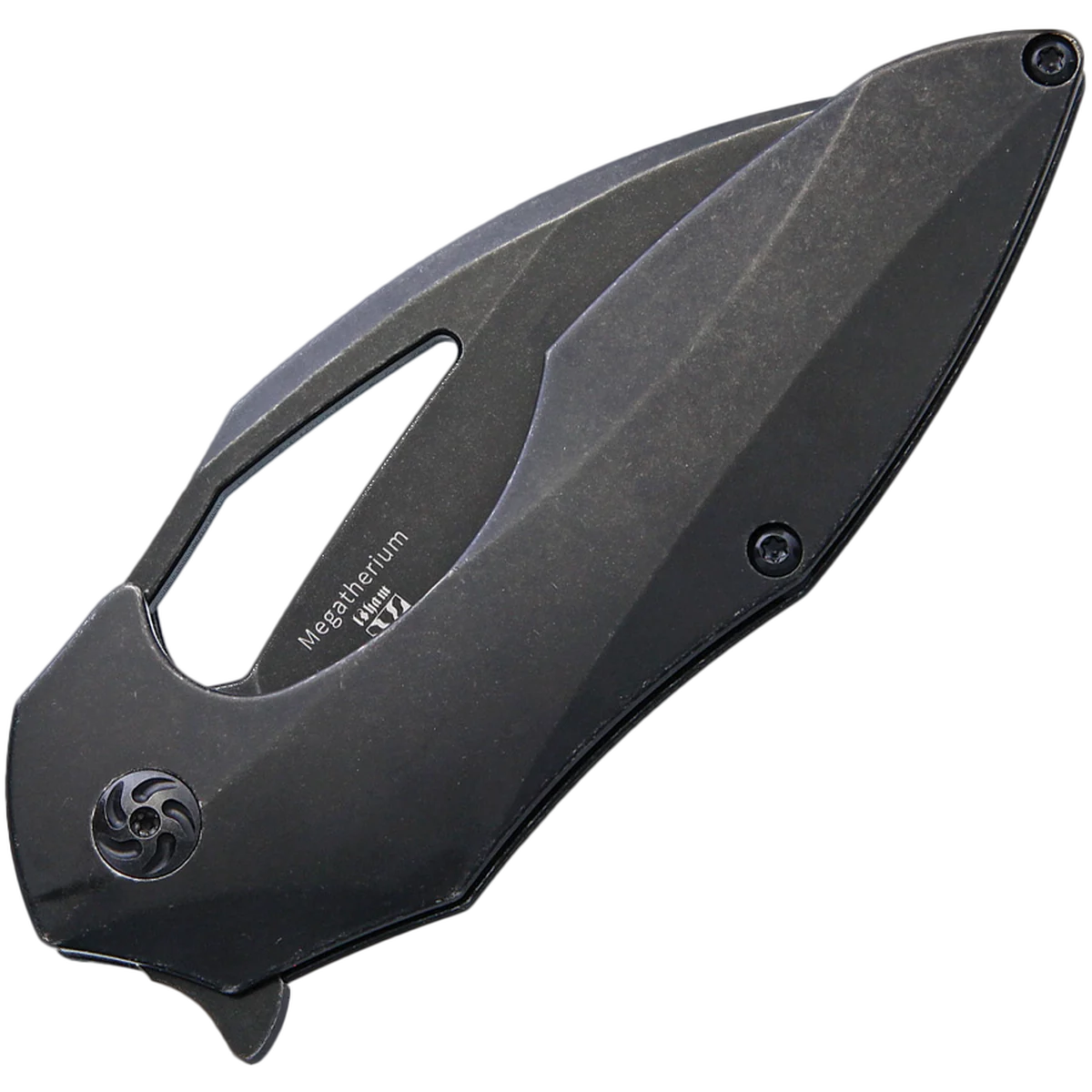 The Kizer Megatherium Ki4502L2 folding knife is set up for left hand use. This knife is created by Elijah Isham. His design will be a stand out in any collection. Elijah has a strong appreciation for surreal art, resulting in unique and creative knife designs that function as good as they look. The Megatherium features a modified wharncliffe black blade made from CPM-S35VN steel and a titanium frame lock handle with a black tumbled finish. The Megatherium comes equipped with Isham's "Edge Below Tab" flipper system, that moves the flipper in the open position for unobstructed performance. Item includes a titanium tip-up pocket clip with a bead blast finish.