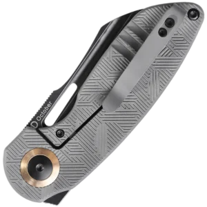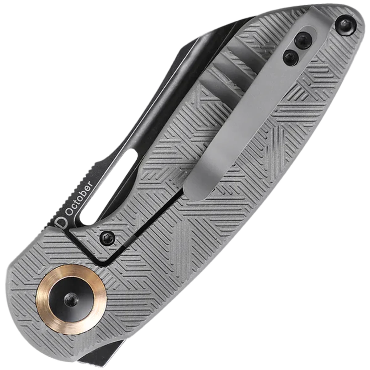 Dmitry Osarenko's design for the October folding knife features a highly machined, beautiful titanium handle that is curved to fit the hand and a finger choil to grip and go. The machined small vertical stripes increase the feel and beauty while a powdery textured finish aids in traction. The options to open this blade are with either the flipper tab or the cut-out thumb hole on the blade. Defined jimping on the blade's spine also is reliable to keep your fingers and hands steady when using. The CPM-20CV steel blade is strong and holds an edge well enough for continuous use.