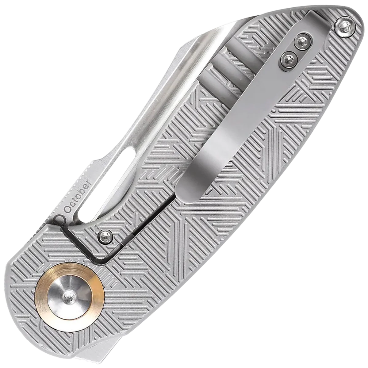 Dmitry Osarenko's design for the October folding knife features a highly machined, beautiful titanium handle that is curved to fit the hand and a finger choil to grip and go. The machined small vertical stripes increase the feel and beauty while a powdery textured finish aids in traction. The options to open this blade are with either the flipper tab or the cut-out thumb hole on the blade. Defined jimping on the blade's spine also is reliable to keep your fingers and hands steady when using. The CPM-20CV steel blade is strong and holds an edge well enough for continuous use.