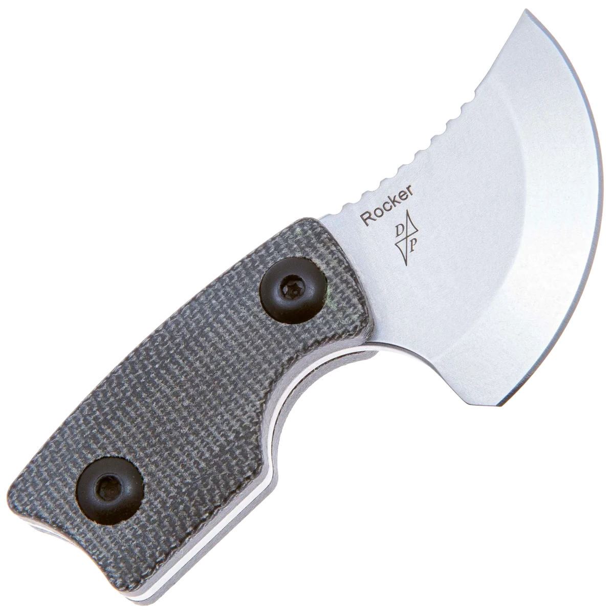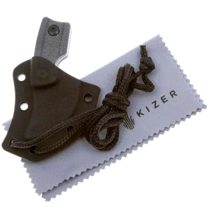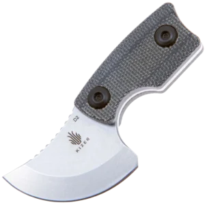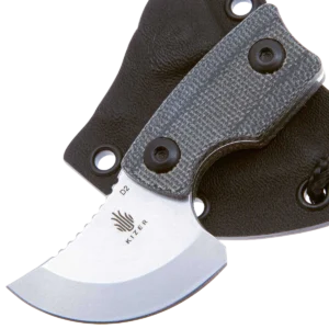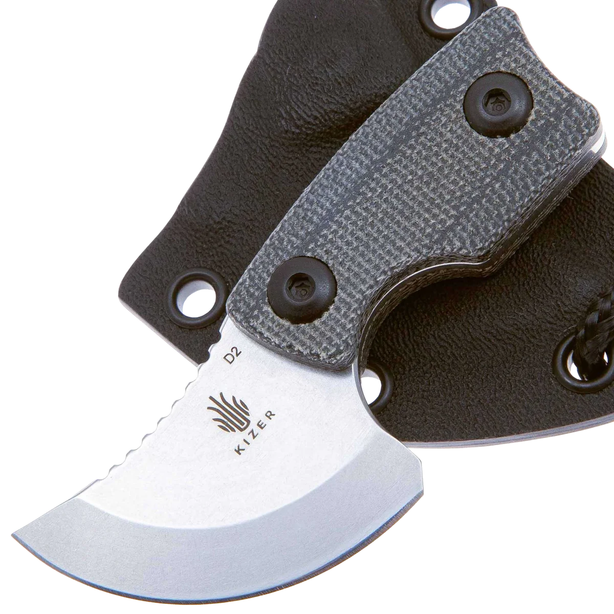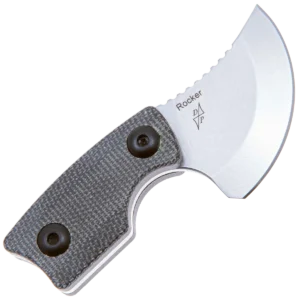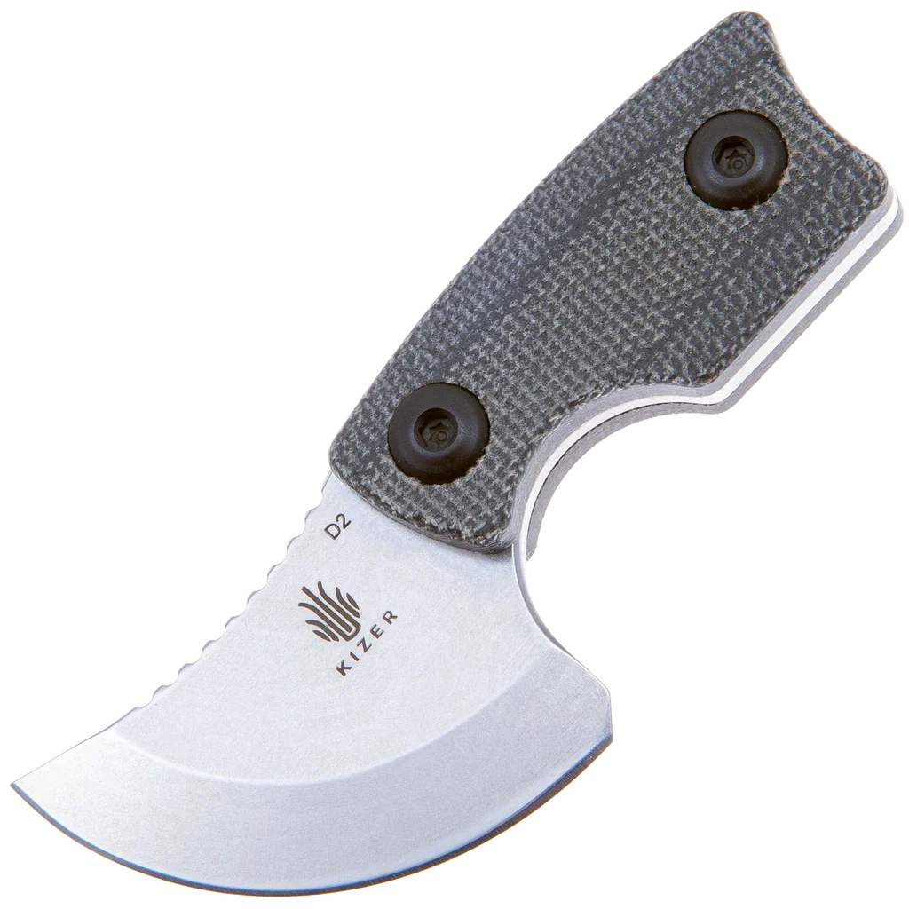The Rocker is designed by Dirk Pinkerton in collaboration with Kizer Knives and is the first neck knife by Dirk that they have made. This knife has a heavy geometric design influence that still manages to balance comfort and function despite its small size. The upswept blade measures only 1.38" with a heavy curve up that makes the cutting surface a quarter circle shape. The knife blade is made from durable D2 with a stonewashed finish that is great for daily use knives. The handles are made from slip-resistant Micarta and have several features like a finger choil and curved end of the handle to help provide a solid grip even with its small size. The curved back of the blade fits your thumb perfectly and the jimping ensures it won't slip. The Rocker comes with a Kydex sheath with a paracord lanyard that allows it to always be at hand, further enhancing its everyday usefulness.