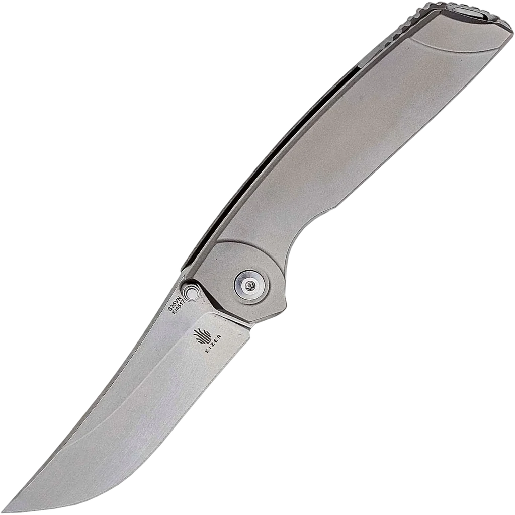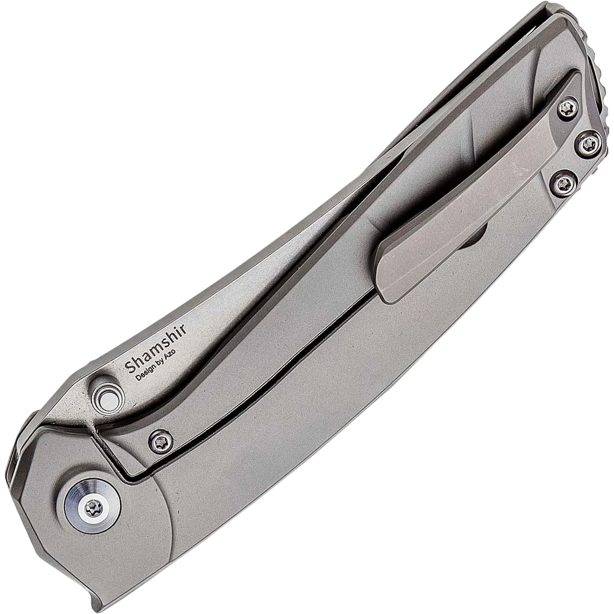 The Shamshir is a mid-size folding knife designed by Azo. It features a 3.25" CPM-S35VN trailing point blade and dual thumb studs with a stonewashed finish. CPM-S35VN steel is popular amongst knifemakers for its toughness and edge holding capability. The handles are made from smooth, high strength titanium which is lightweight and corrosion-resistant. The action is smooth and has a satisfying detent for easy one-hand opening. The Shamshir folder is equipped with a tip-up, right carry titanium pocket clip.
