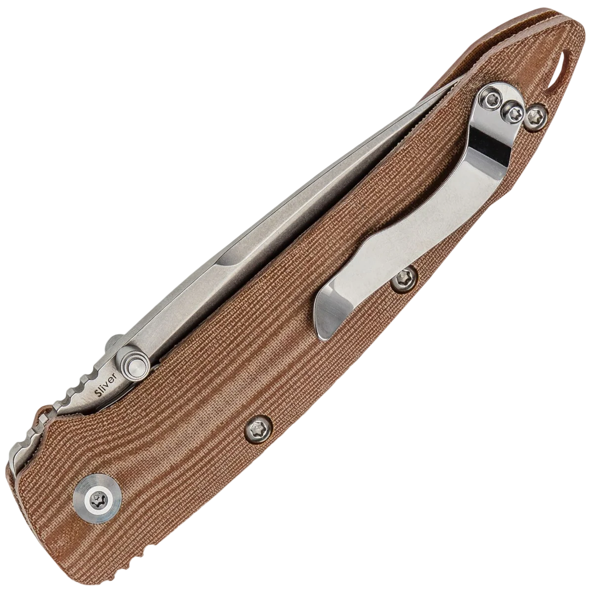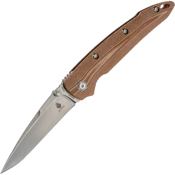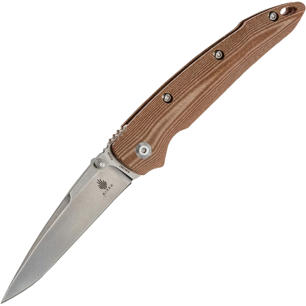 The Kizer Ki4419A5 Sliver folding knife is a sleek, lightweight, everyday carry (EDC) knife that's available at an affordable price. This particular folder has brown micarta handles milled to perfection. The grooves not only make the grip outstanding, they provide a unique design pattern. The frame is slender and easily fits in the pocket with a tip-up pocket clip. The blade, crafted from CPM-S35VN stainless steel, is a stonewashed drop point style. S35VN is a top notch steel with exceptional edge retention and wear resistance. This knife features a liner locking system, thumb studs for one hand opening, spine jimping and a lanyard hole. Kizer's sleek design is complemented by the first-rate components they use.