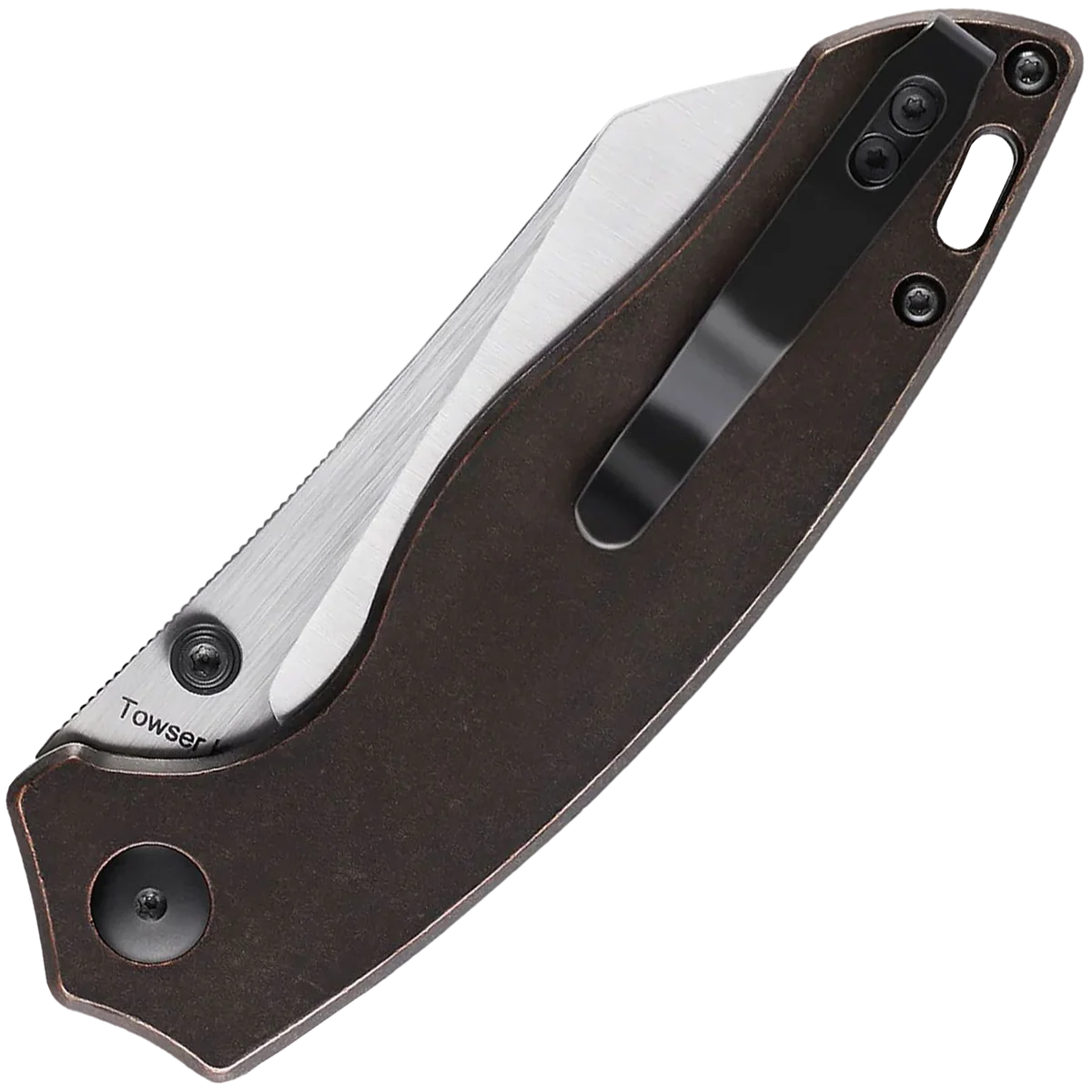 The Towser K is a distinctive, unique folding knife designed to be a functional and attractive EDC knife. If there were ever such thing as a folding Santoku kitchen knife, it would look a lot like this. If you're cutting against a surface, the angle of the edge and the design of the handle keeps the fingers away from the table. Be it tape, food, or packaging, the Towser K will make your cutting job easy and comfortable. The Towser K features dual thumb studs, a tip-up pocket clip and a stainless steel liner lock mechanism.