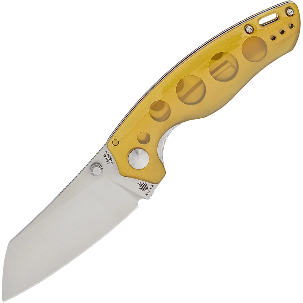 This new model of the Kizer Towser K features the latest durable handle material, PEI Ultem. PEI is highly resistant to high temperatures, corrosion, chemicals and has excellent electrical insulation properties. With the amber luster, the inner piece of the handle can be directly seen through the surface of the handle. The blade steel is 154CM, 154CM was originally developed as an industrial material (Boeing 747’s turbine blade steel is 154CM), the properties are relatively balanced, and it performs well in corrosion resistance and edge retention properties. If there were ever such thing as a folding Santoku kitchen knife, it would look a lot like this. If you're cutting against a surface, the angle of the edge and the design of the handle keeps the fingers away from the table. Be it tape, food, or packaging, the Towser K will make your cutting job easy and comfortable.