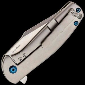 The Kizer Ursa Minor is an attractive and effective pocket knife designed by Ray Laconico. There’s one thing you’ll notice straight away when you hold the Kizer Ursa Minor: you don’t feel a single sharp edge. Except for the razor-sharp knife-edge, of course. The titanium handle has magnificent contours. The pearled finish makes it look like a pebble that has been polished smooth through years of drifting along in the rivers, but still retains some roughness. The blade has a harpoon-style bulge on the spine. This can be used as a ridge to apply some extra pressure on tougher jobs. The hollow grind blade is made from S35VN steel. Opening the knife is super quick thanks to the flipper. The blade runs on ceramic ball bearings. Once opened, the blade is held firmly in place by the frame lock. A steel insert has been included to prevent wear and overstretching.