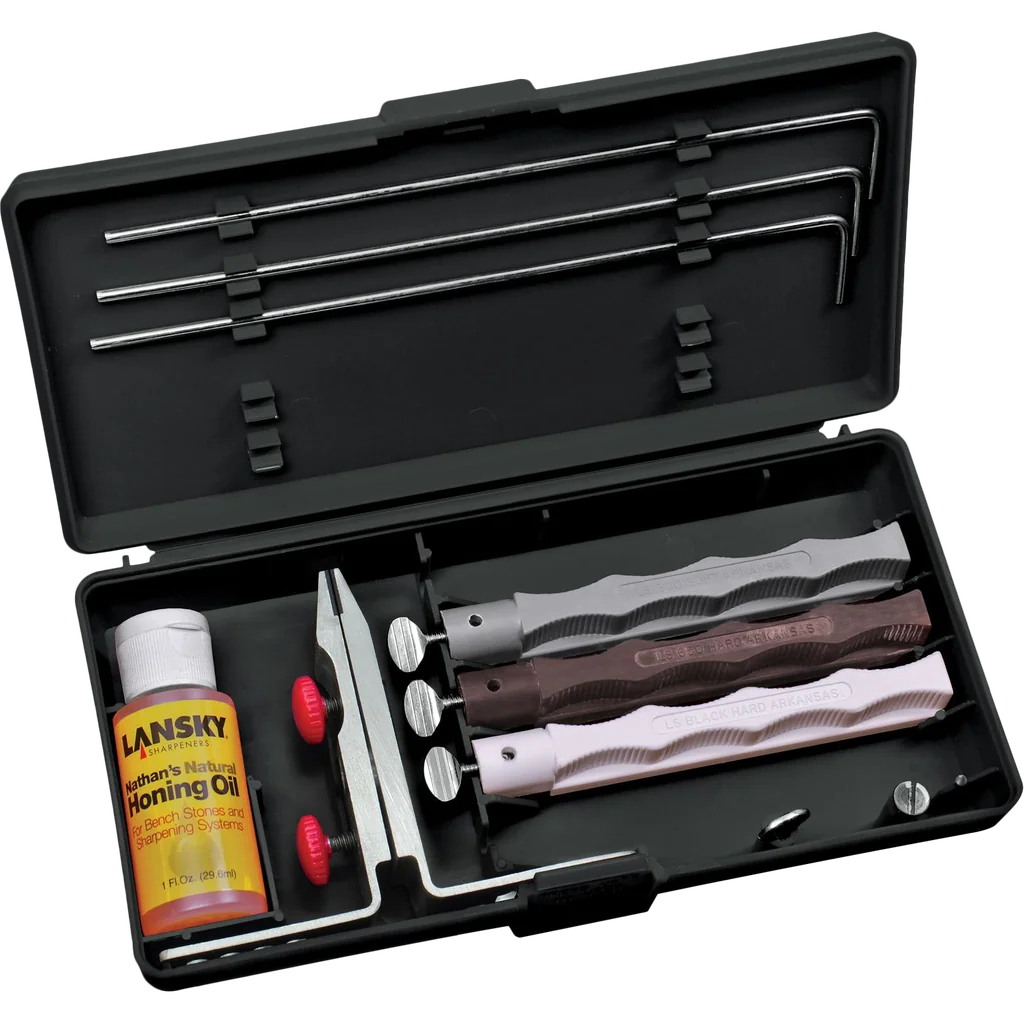 The Ultimate in Sharpening Systems Technology Safe, Easy and Convenient to Use. The Lansky Controlled-Angle Sharpening System is designed to give your blade a professional, razor sharp edge every time. Includes Soft Arkansas Hone Hard Arkansas Hone Black Hard Arkansas Hone All Systems Include Patented, precision-engineered, multi-angle, flip-over knife clamp. Sharpening hones on color-coated, finger-grooved safety holders One guide rod for each honing stone Specially formulated honing oil Extra long knife clamp screws Custom molded storage/carrying case to hold all system components Complete easy-to-follow multi-lingual instructions