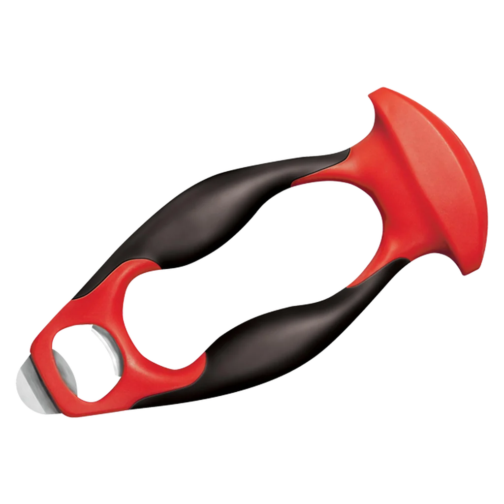 The Hammerhead™ combines Lansky’s popular “V” shaped Tungsten Carbide and Ceramic Rod sharpening elements with a convenient bottle cap opener and beverage tab opener. The Tungsten Carbide Sharpener is ideal for lightning quick repairs and the Ceramic Sharpening Rods polish a finished edge in just three or four strokes. Swift repairs on kitchen, hunting and outdoors knives are simple when utilising both sharpening elements. The ergonomic rubber safety handle makes the Hammerhead™ both easy and safe to use for left or right handed individuals. The Hammerhead™ Sharpener is a great multipurpose tool for outdoorsmen and the chef at home, where cold beverages and a good sharp knife are essential. Perfect for camping, barbequing or the home. Instructions Place knife on a flat surface with 1/2 inch of the blade over the edge. Hold the knife steady with one hand, gripping the sharpener with the other hand as indicated. Pull the Hammerhead™ over the blade lightly in the direction shown, following the curve of the blade. Repeat 3 to 4 times to produce a razor-sharp edge. The grey carbide sharpens and the white ceramic finishes. Clean knife thoroughly. Hold the can firmly with one hand. Using the other hand, slide thetab-opener element underneath the tab until it stops. Use the Hammerhead™ as a lever to pop open the can. Enjoy! Be Smart, Be Safe and Stay an Edge Above the Rest! CAUTION: Knife sharpening is an inherently dangerous activity. Used properly this sharpener cannot hurt you but a carelessly handled blade or pointed object can.