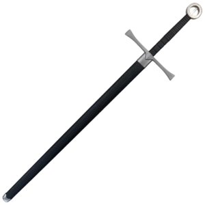 Irish hand and a half sword dating from around 1475 – 1525 A.D. It features a full tang construction and a high carbon blade that is flexible and strong. The handle features a high polished steel cross guard and characteristic ring pommel with leather wrapped handle. This sword is light and quick for it's size. A wood scabbard that is wrapped in leather with steel band at the throat and steel tip is included. It features the high quality fit and finish that has been known for all Legacy Arms swords. The blade is 34 3/4" high carbon spring steel with a hefty full tang.