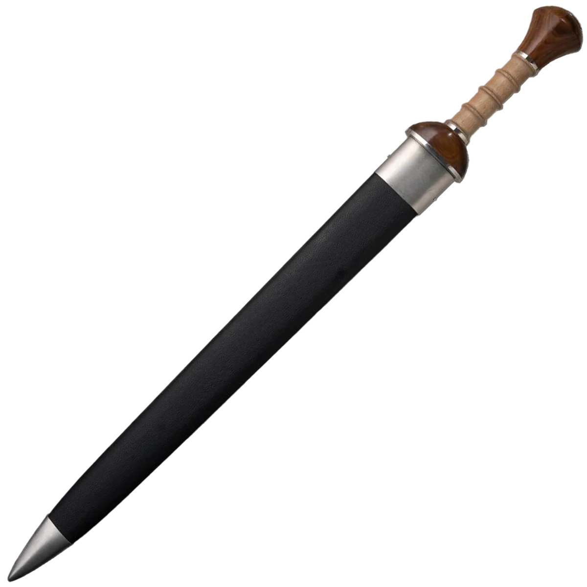 The Legacy Arms classic Imperial Roman Gladius (or short sword) mimics an original found in the ruins of Pompeii (reliably dating from 79 CE). Features a double edged high carbon blade, hard wood handle & high polished steel spacer at the bottom of the handle for strength and durability. The sword also includes a wood scabbard wrapped in black leather with steel accents at throat and tip. Point of Balance: 4 3/4", Thickness at Guard: 5.5mm, Thickness at Tip: 1.5mm